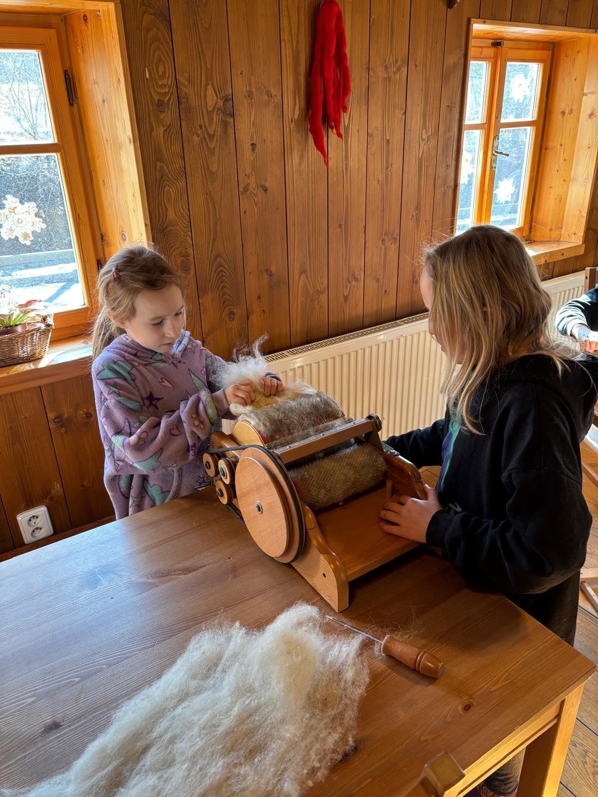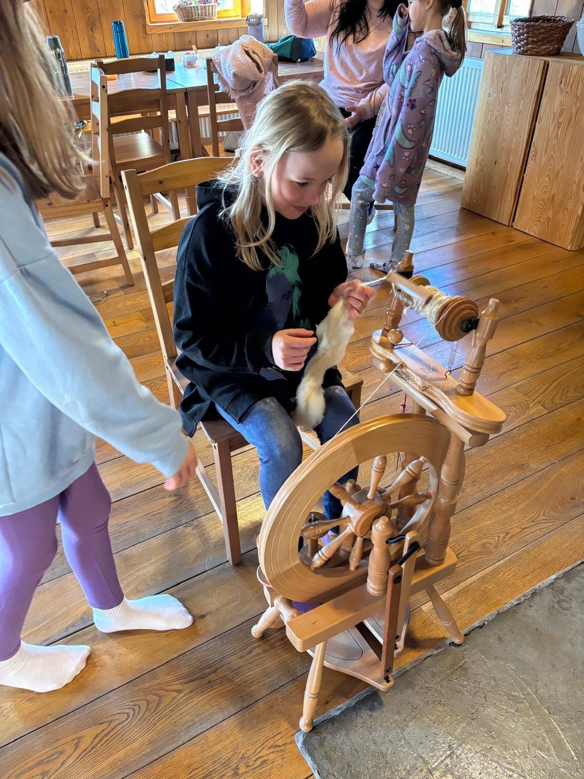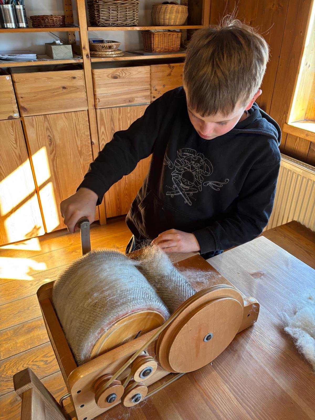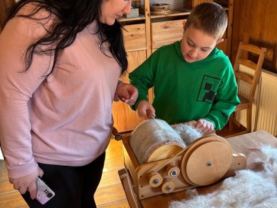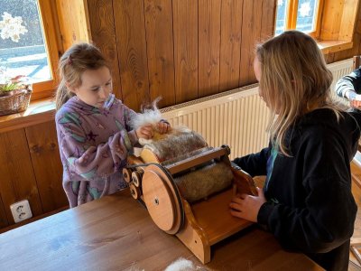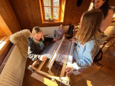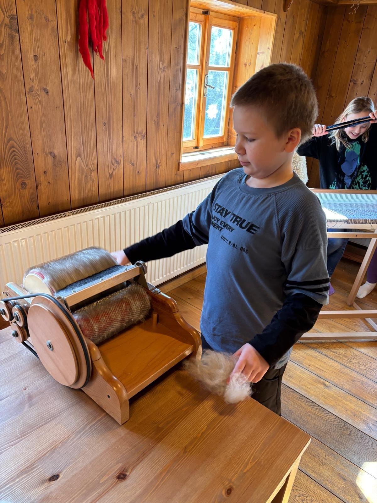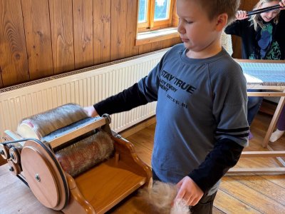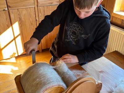 Seznámili jsme se také s tím, jak se vlna zpracovává a na vlastní kůži jsme okusili, jaká je s tím práce. Česání vlny, práce na kolovrátku i tkalcovském stavu nás velmi bavila. Z námi načesané vlny jsme si pomocí mokrého plstění vyrobili vlnové míčky.