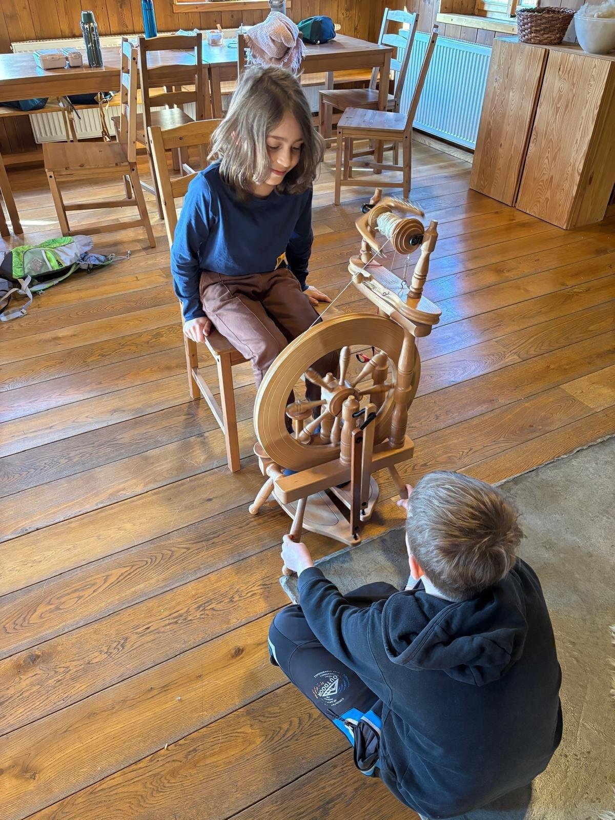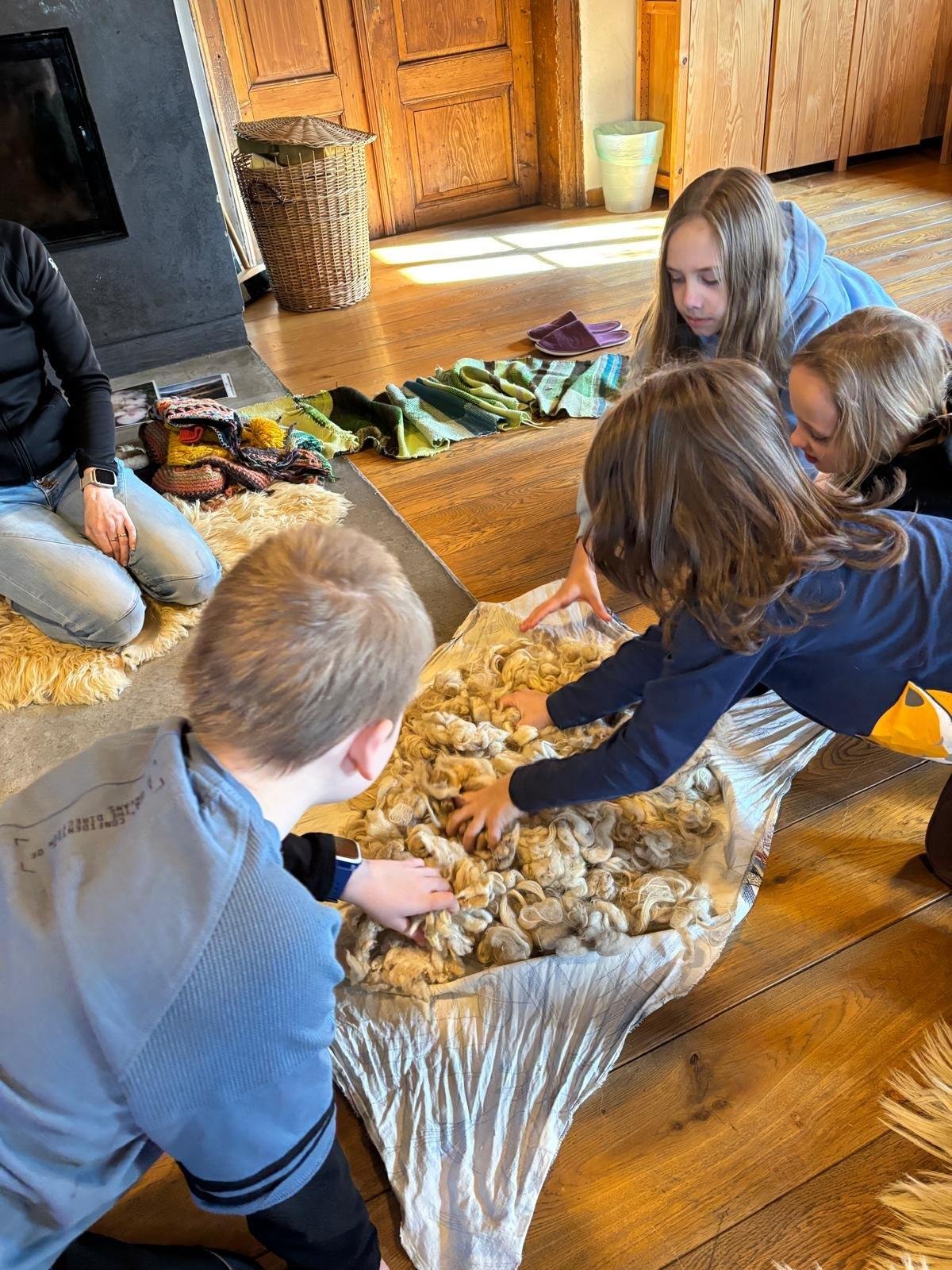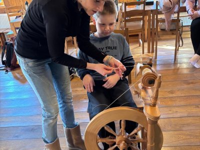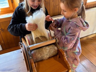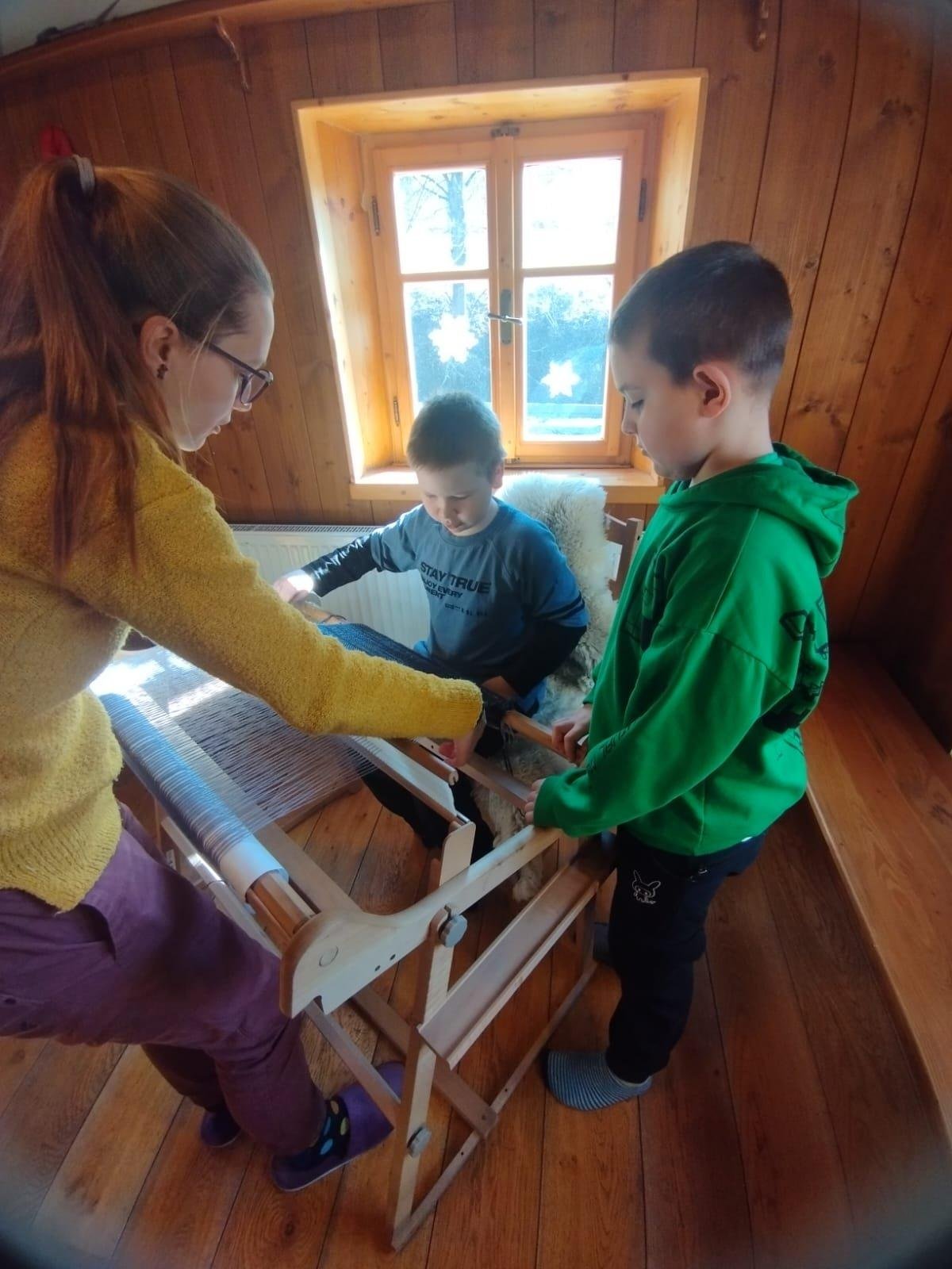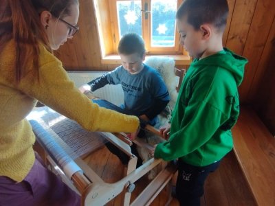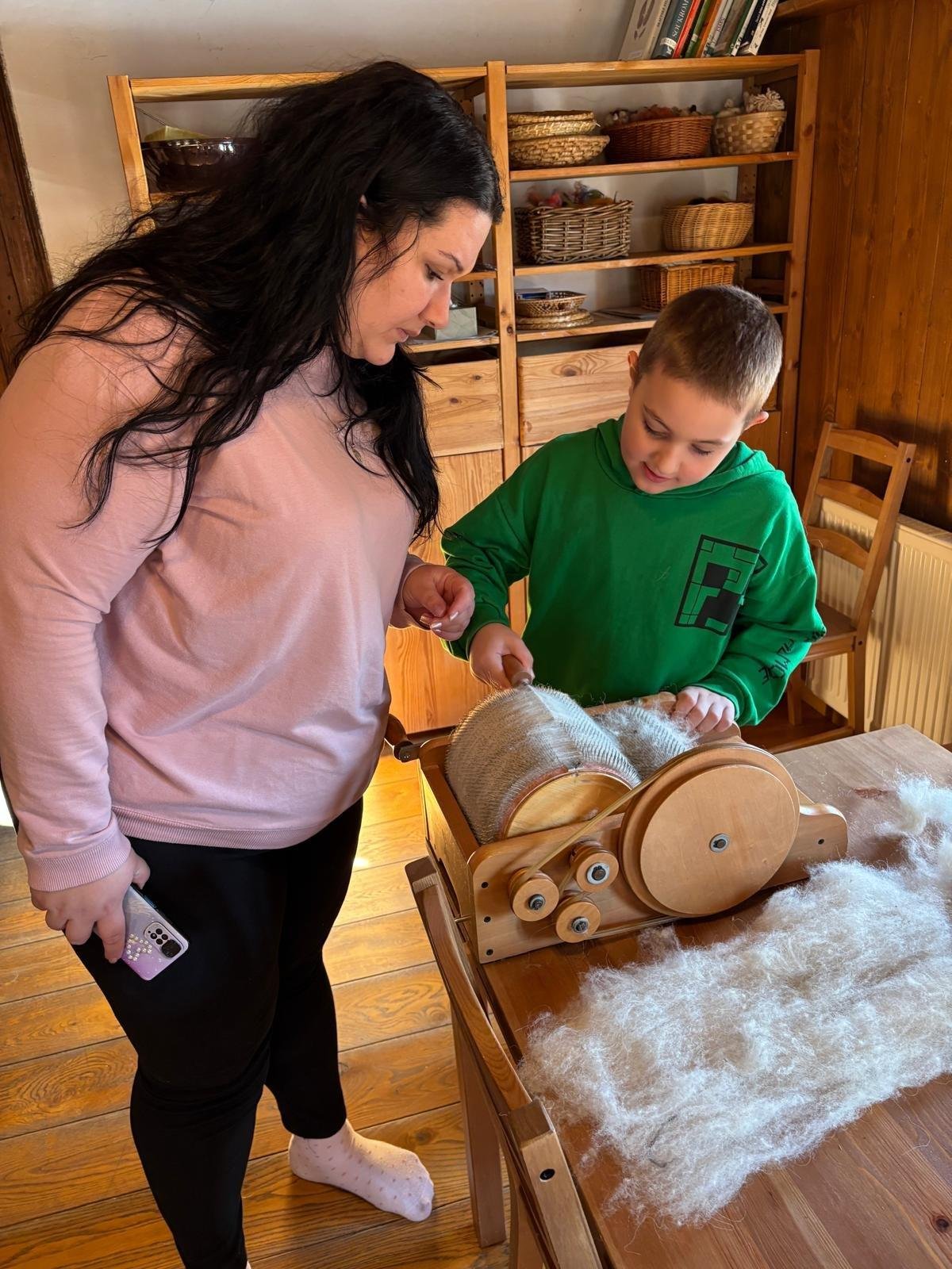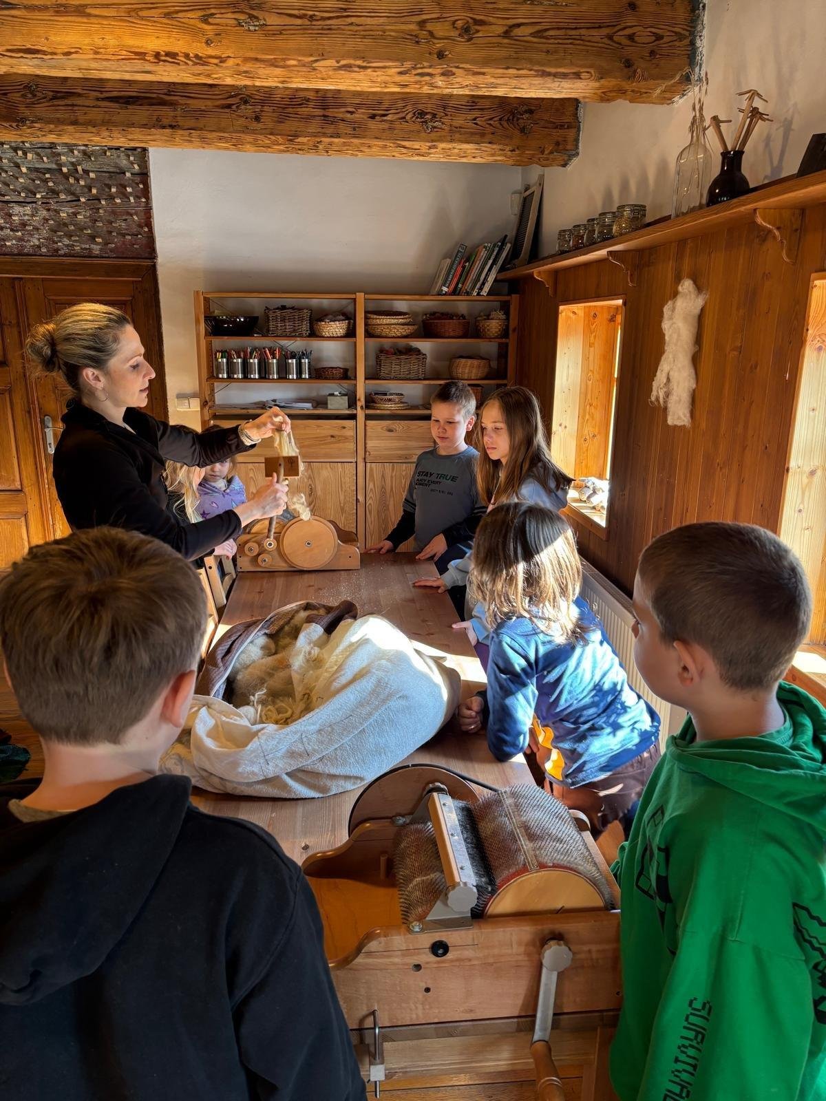 Seznámili jsme se také s tím, jak se vlna zpracovává a na vlastní kůži jsme okusili, jaká je s tím práce. Česání vlny, práce na kolovrátku i tkalcovském stavu nás velmi bavila. Z námi načesané vlny jsme si pomocí mokrého plstění vyrobili vlnové míčky.