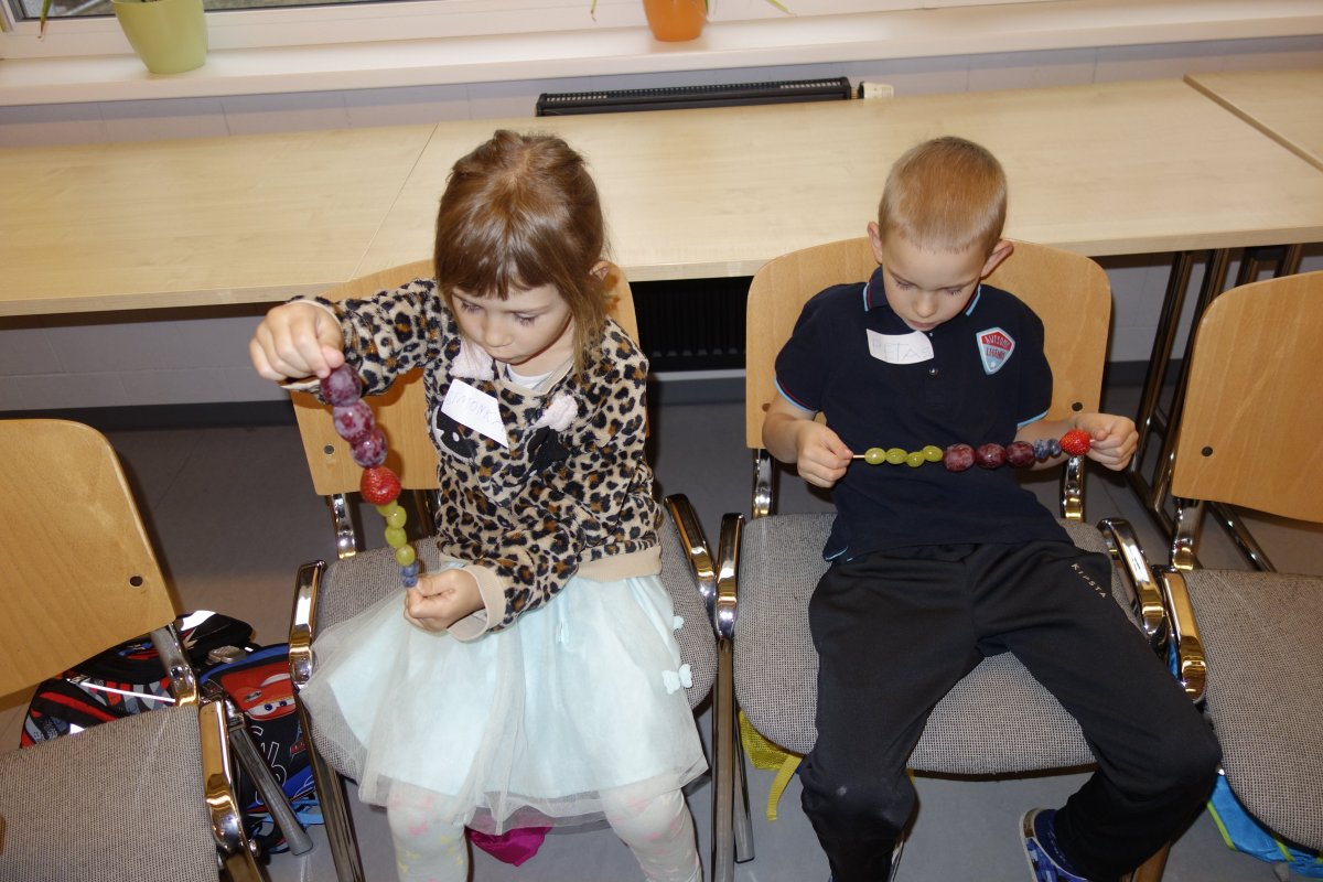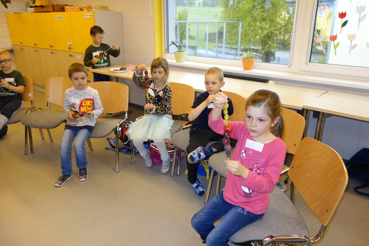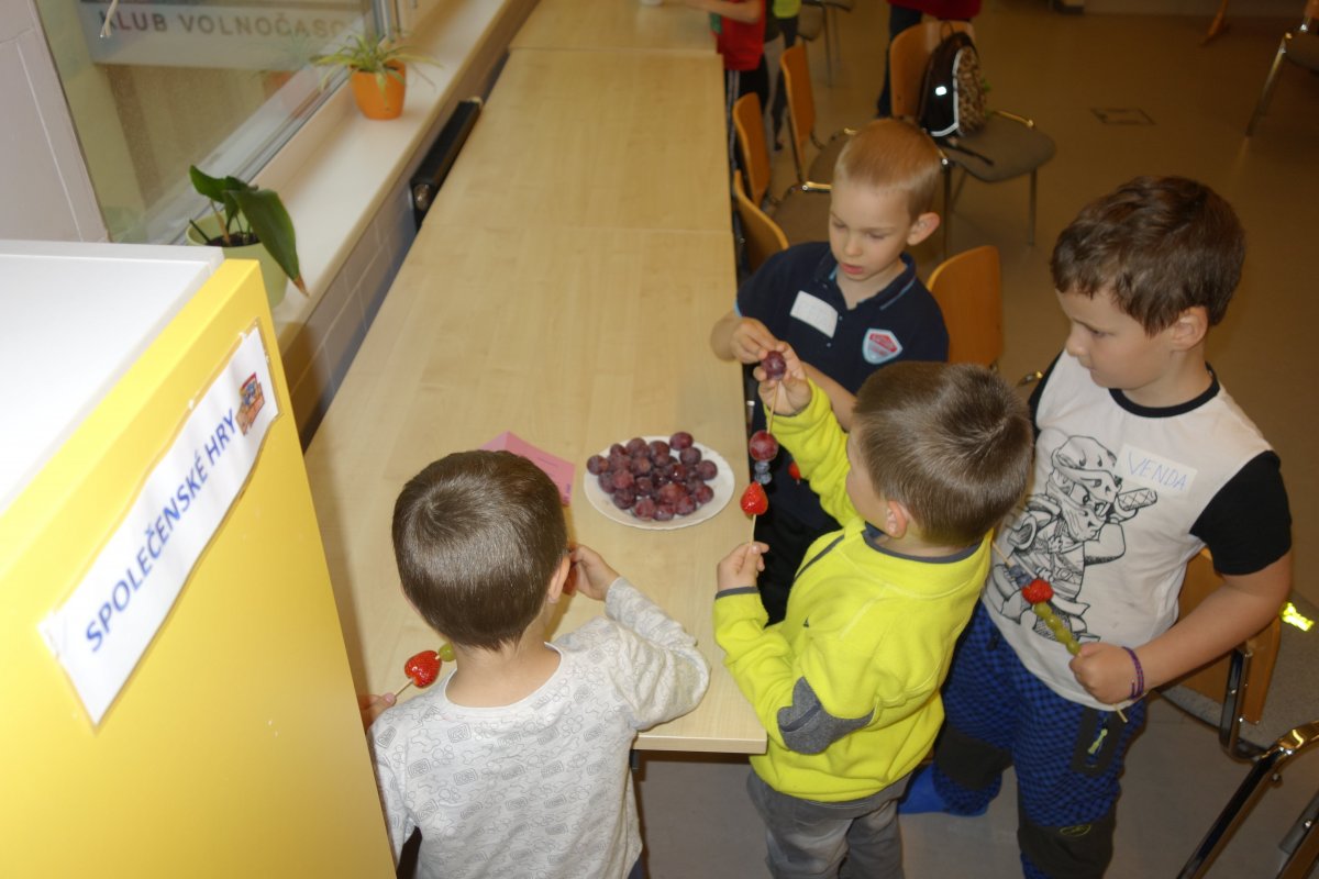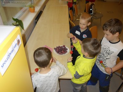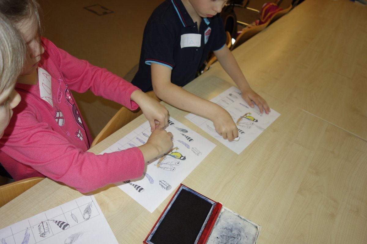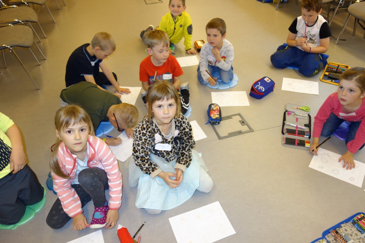 První setkání s dvanácti budoucími prvňáčky probíhalo v příjemné náladě. Hráli jsme hry na seznámení, navlékali jsme ovocné špízy podle daného počtu, opakovali jsme pozice vlevo, vpravo, nahoře, dole a uprostřed. Zapamatovali jsme si dopravní prostředky, zvířata a jiné obrázky v různých souřadnicích. Jednoduché obrazce jsme překreslili do sítě. Nakonec jsme sýkorce razítkovali peříčka a obrázek jsme si mohli odnést domů.