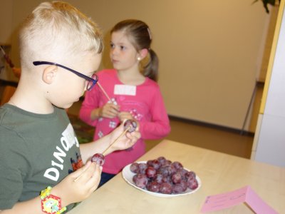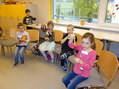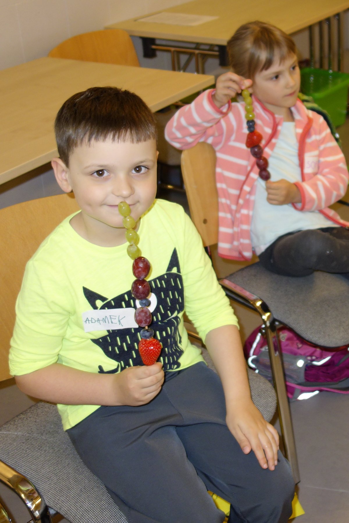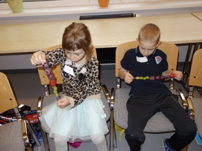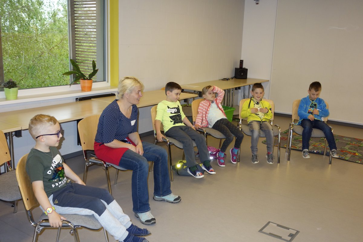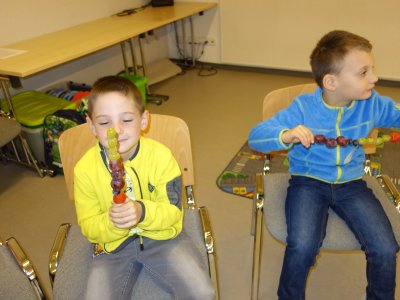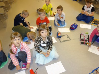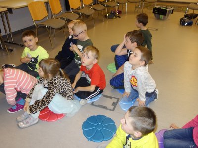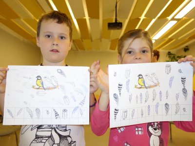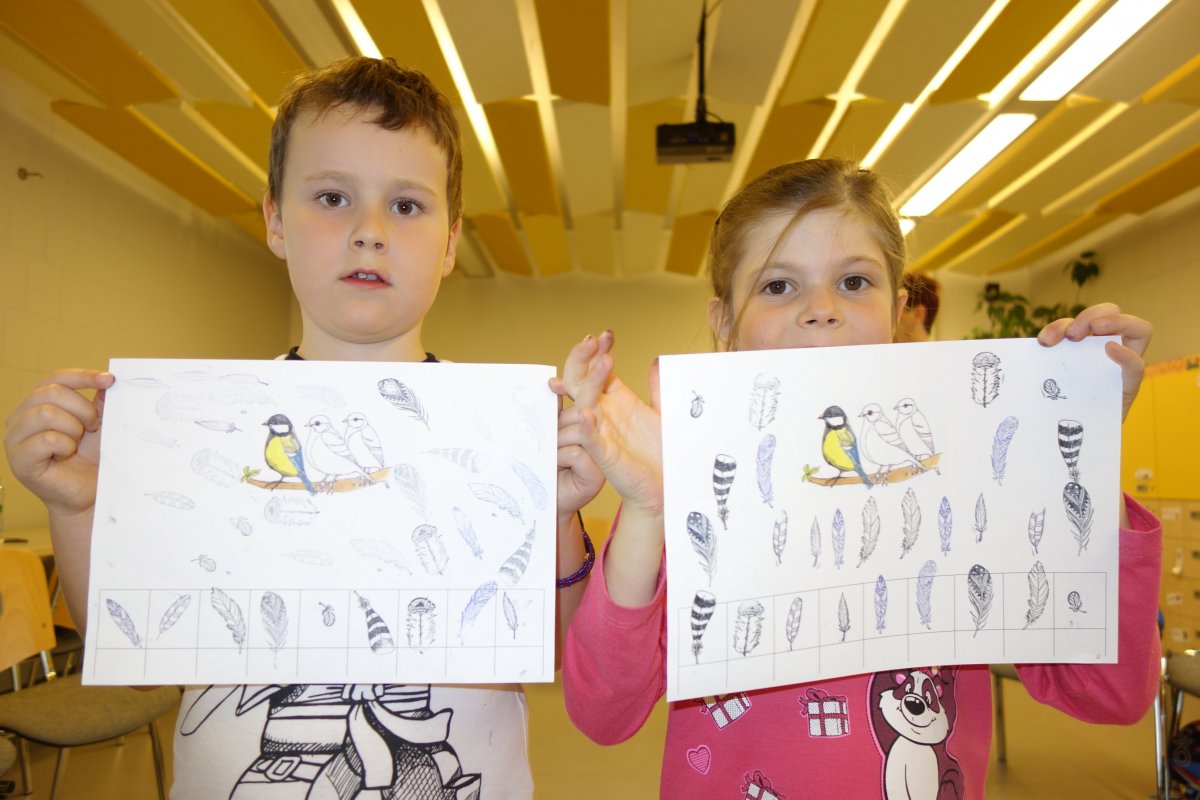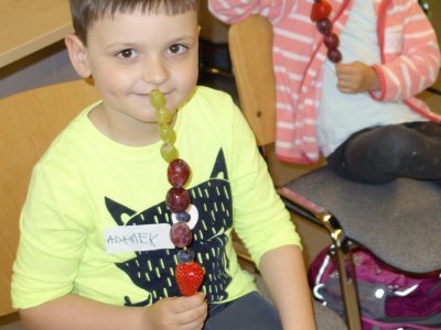 První setkání s dvanácti budoucími prvňáčky probíhalo v příjemné náladě. Hráli jsme hry na seznámení, navlékali jsme ovocné špízy podle daného počtu, opakovali jsme pozice vlevo, vpravo, nahoře, dole a uprostřed. Zapamatovali jsme si dopravní prostředky, zvířata a jiné obrázky v různých souřadnicích. Jednoduché obrazce jsme překreslili do sítě. Nakonec jsme sýkorce razítkovali peříčka a obrázek jsme si mohli odnést domů.