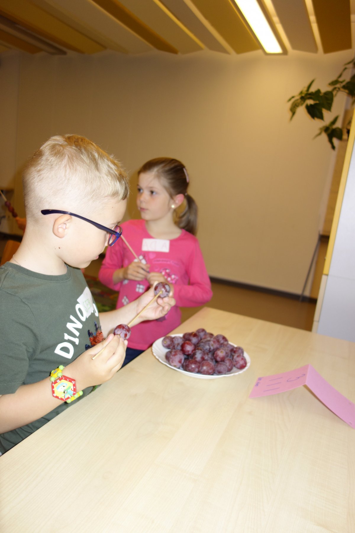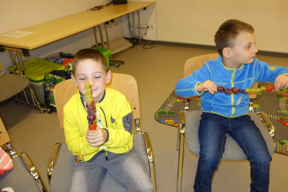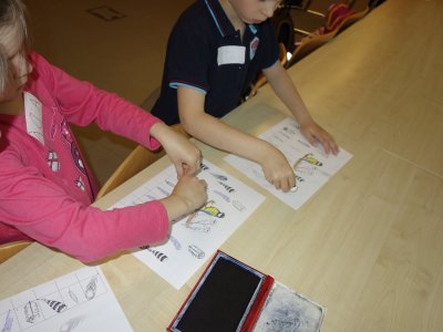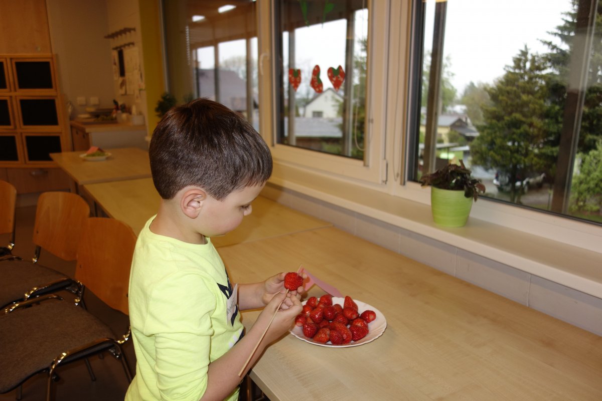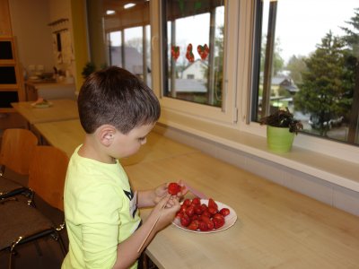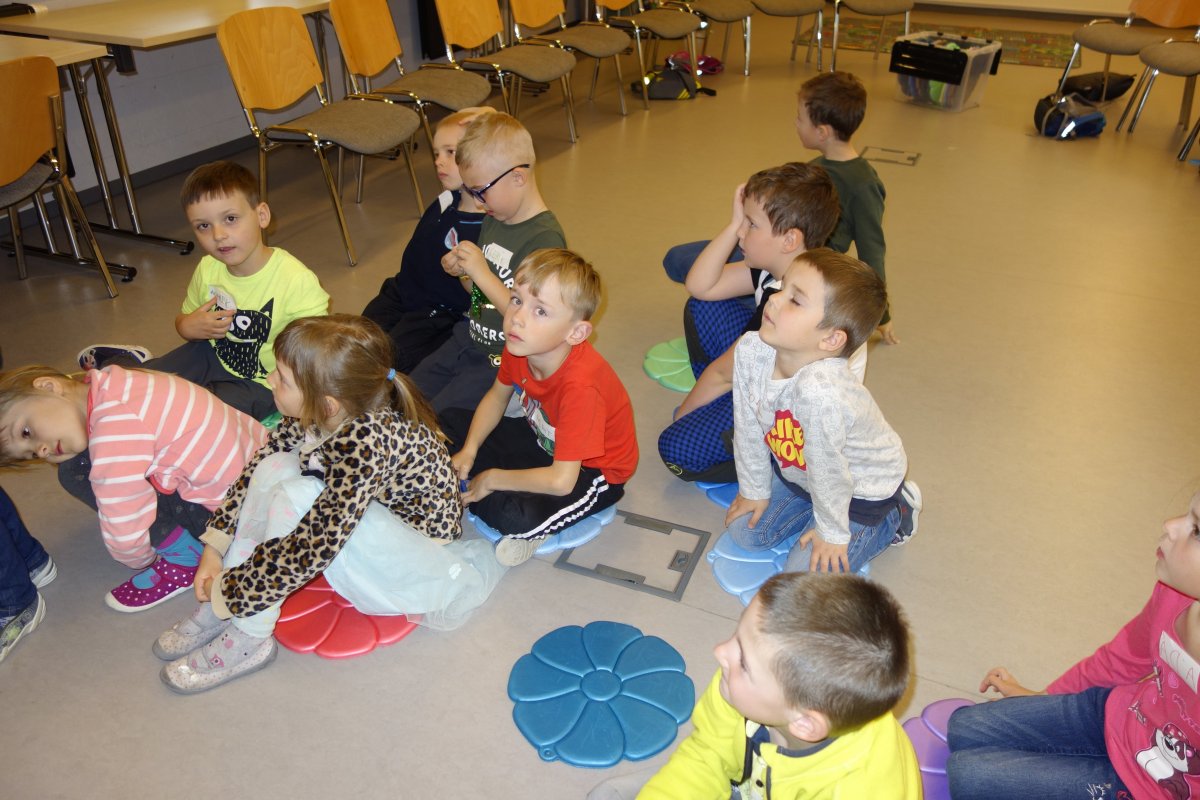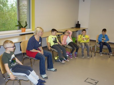 První setkání s dvanácti budoucími prvňáčky probíhalo v příjemné náladě. Hráli jsme hry na seznámení, navlékali jsme ovocné špízy podle daného počtu, opakovali jsme pozice vlevo, vpravo, nahoře, dole a uprostřed. Zapamatovali jsme si dopravní prostředky, zvířata a jiné obrázky v různých souřadnicích. Jednoduché obrazce jsme překreslili do sítě. Nakonec jsme sýkorce razítkovali peříčka a obrázek jsme si mohli odnést domů.