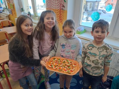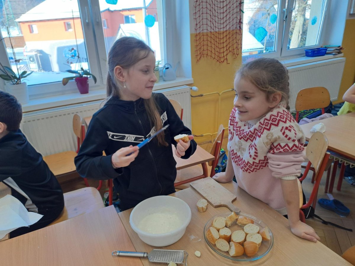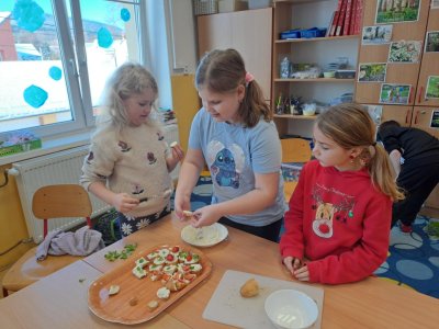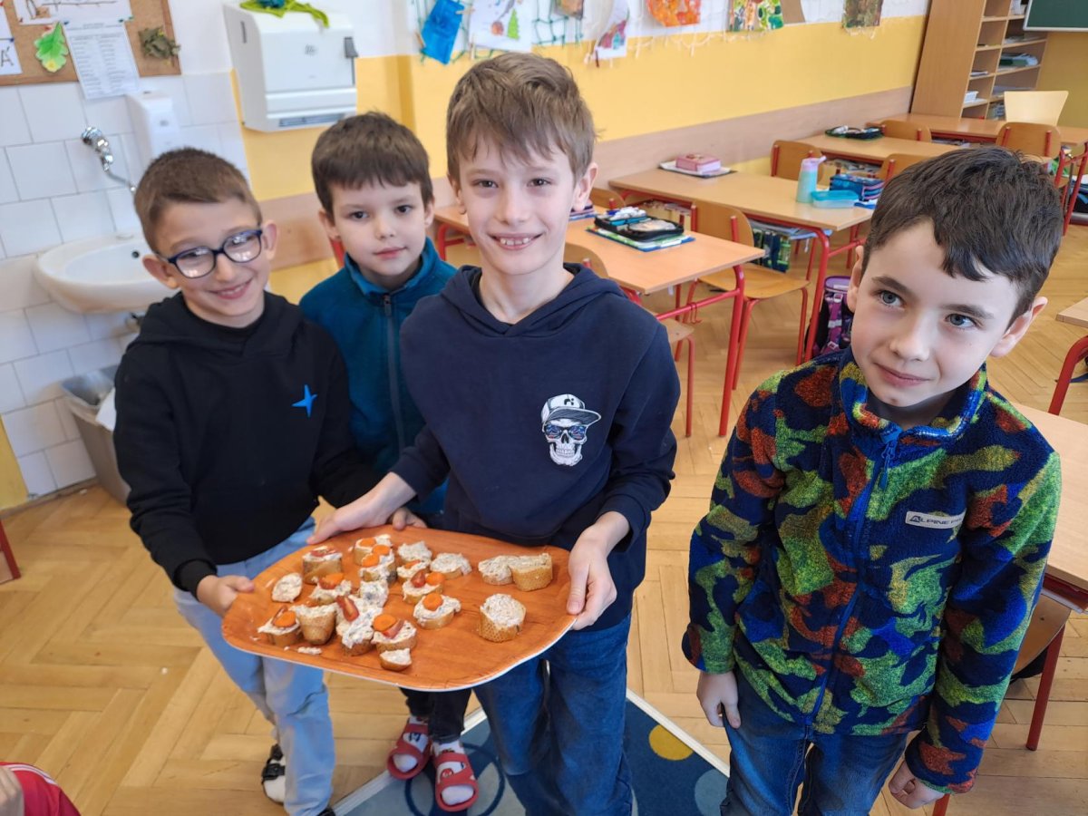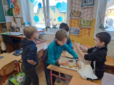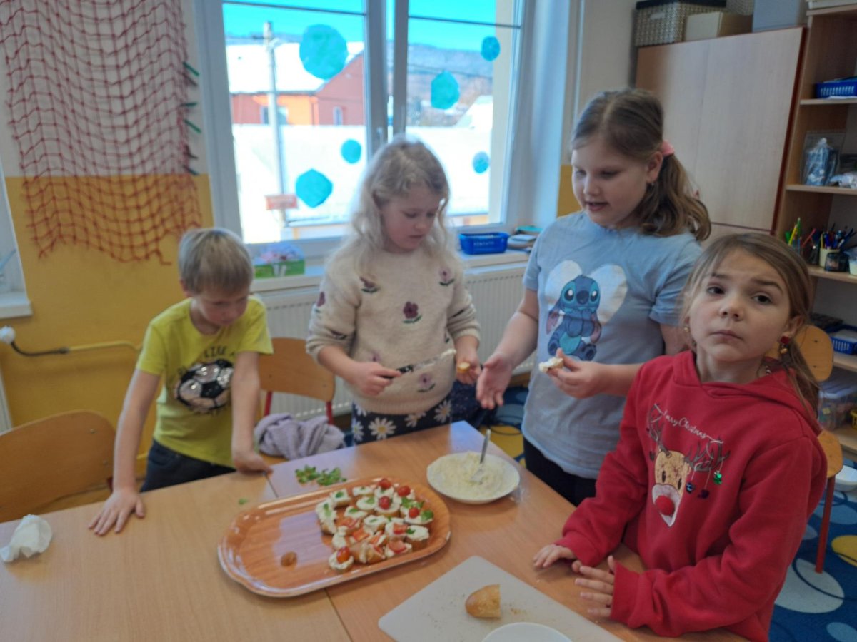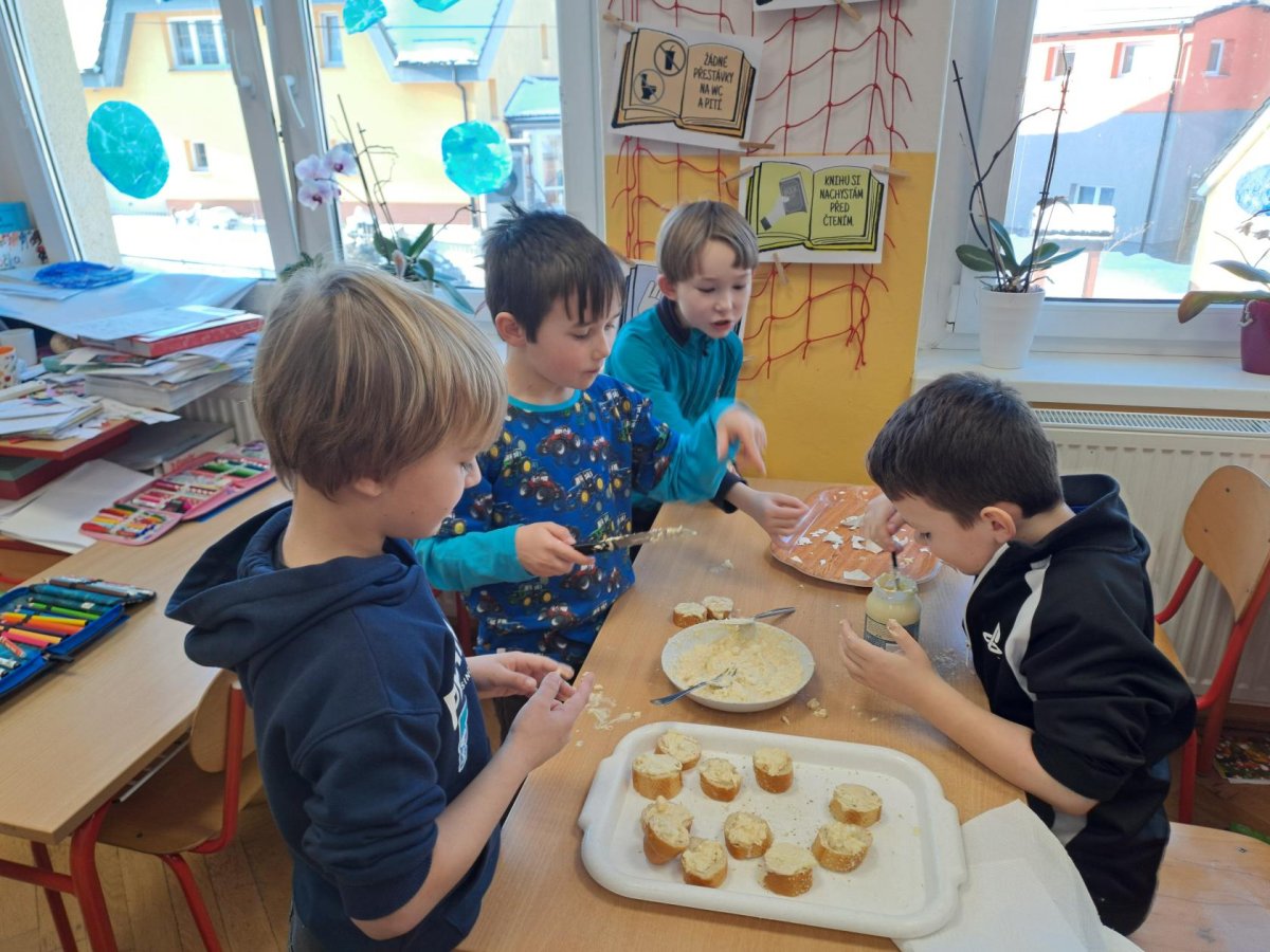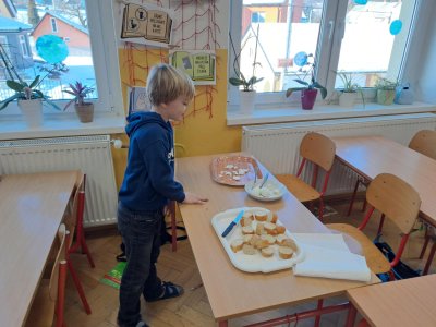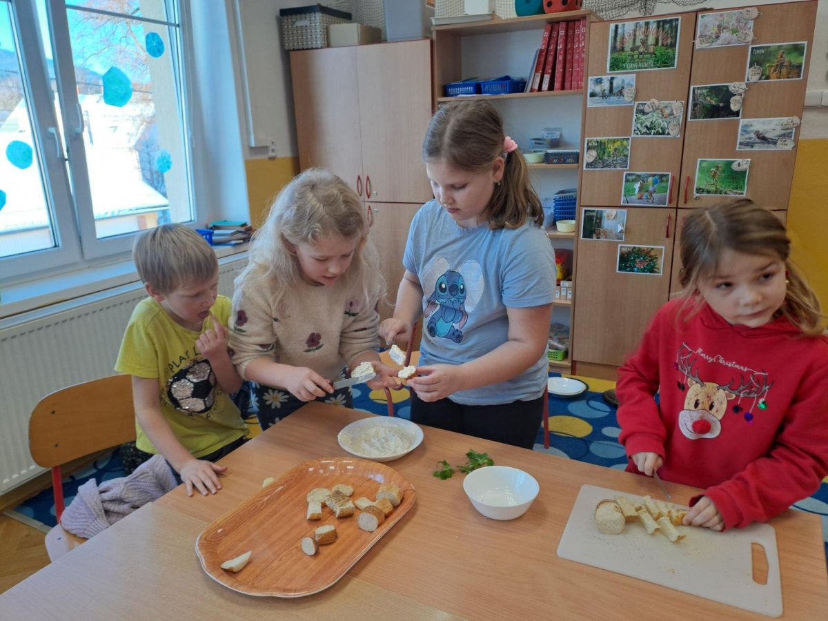 Pracovní výchovu jsme po Novém roce pojali jako vaření - přípravu pomazánek a jednohubek. Někteří zvládli připravit pohoštění pro ostatní bravurně, zcela samostatně, jiní budou muset mamce/taťkovi začít občas pomáhat v kuchyni, aby zjistili, k čemu které náčiní v kuchyni vlastně slouží....