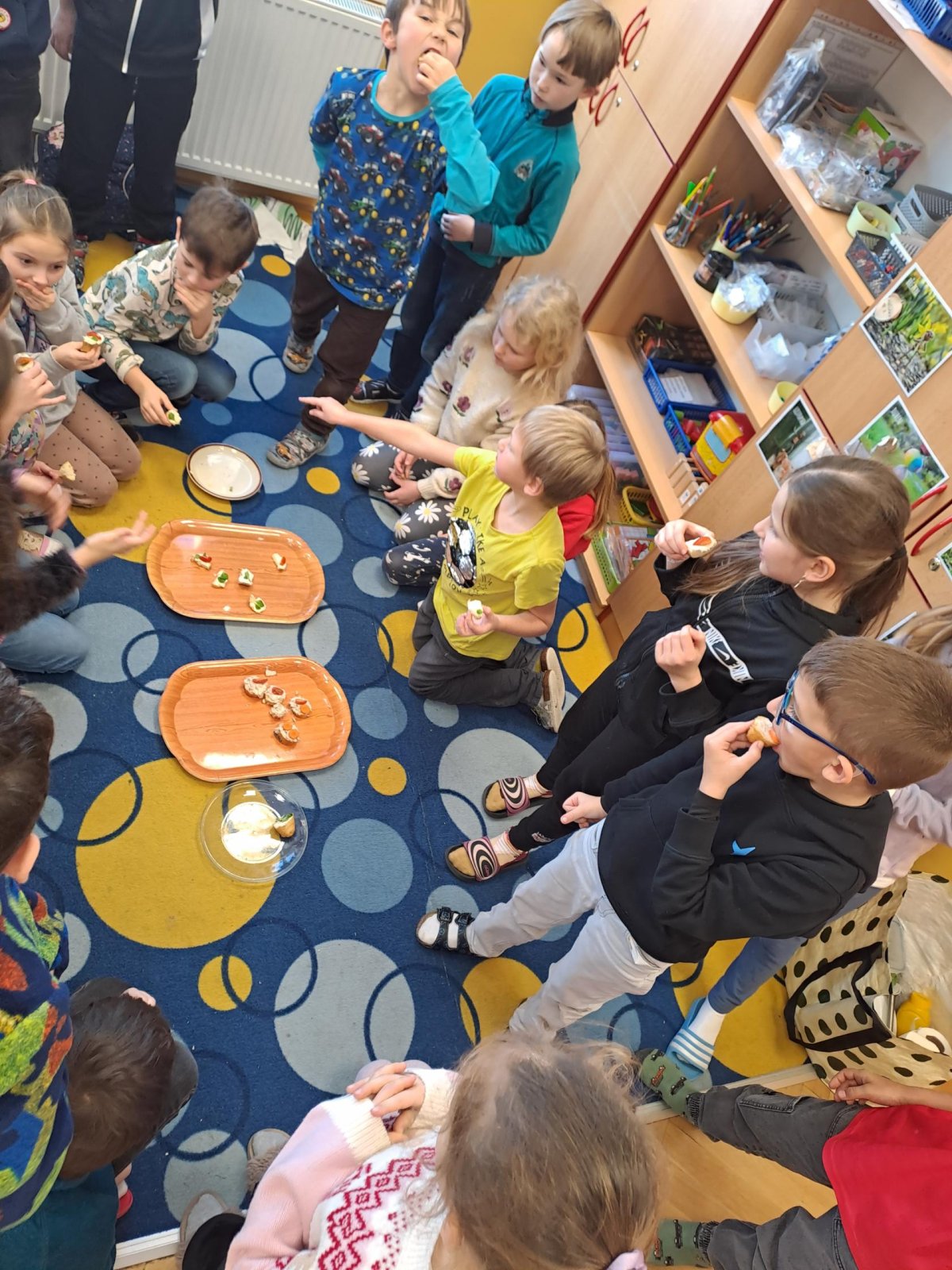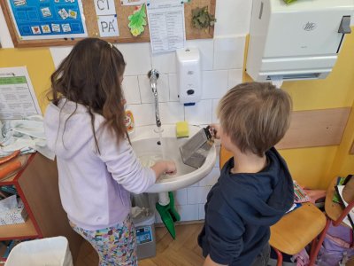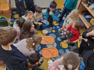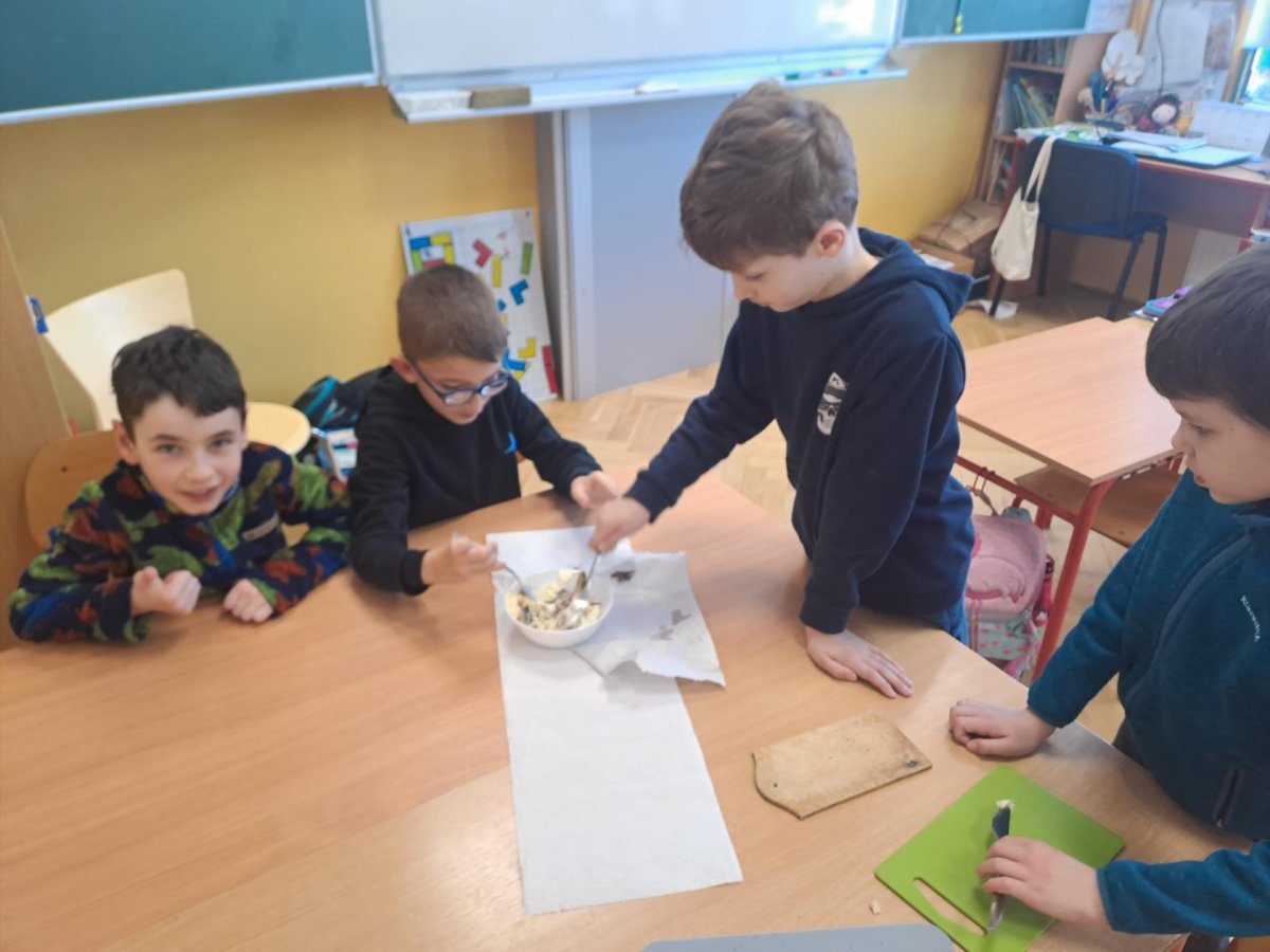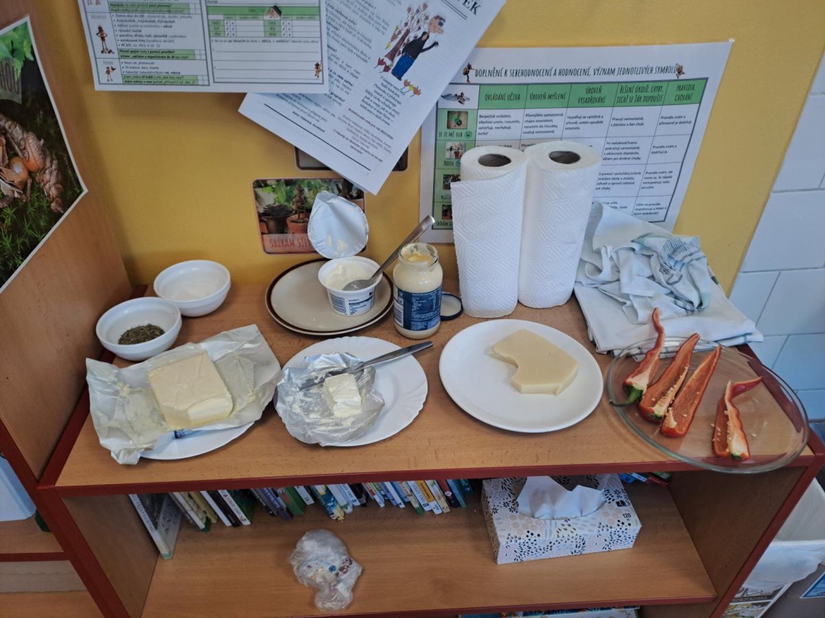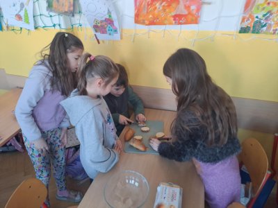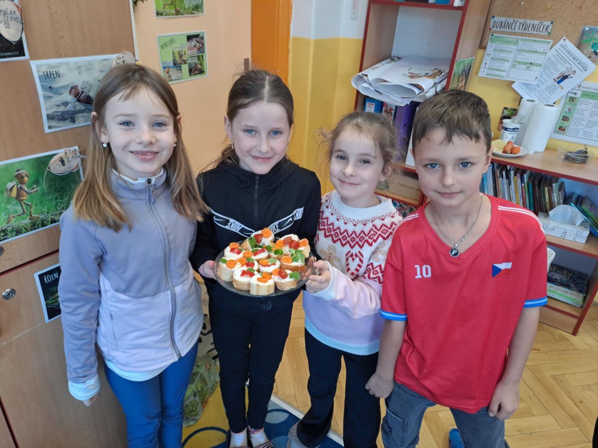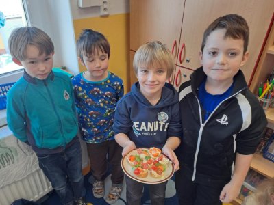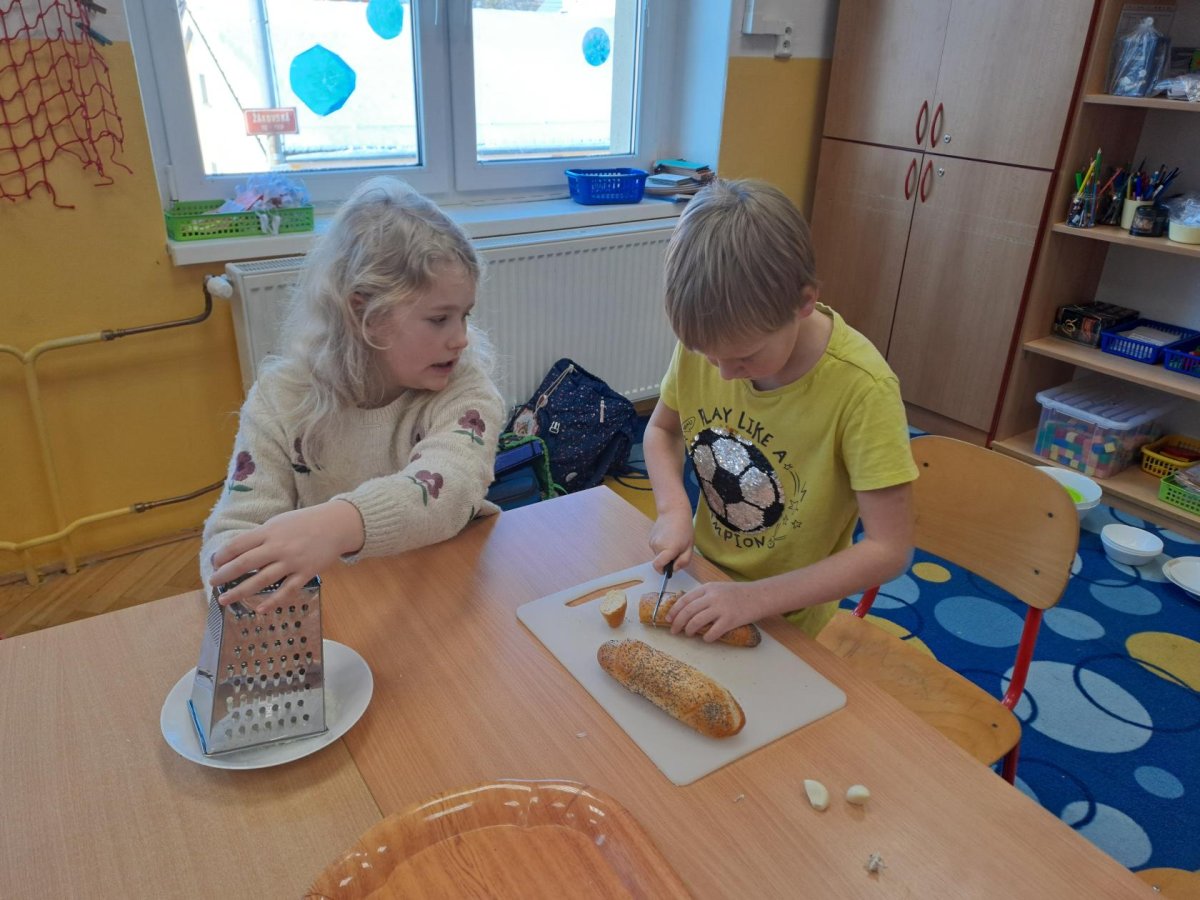 Pracovní výchovu jsme po Novém roce pojali jako vaření - přípravu pomazánek a jednohubek. Někteří zvládli připravit pohoštění pro ostatní bravurně, zcela samostatně, jiní budou muset mamce/taťkovi začít občas pomáhat v kuchyni, aby zjistili, k čemu které náčiní v kuchyni vlastně slouží....