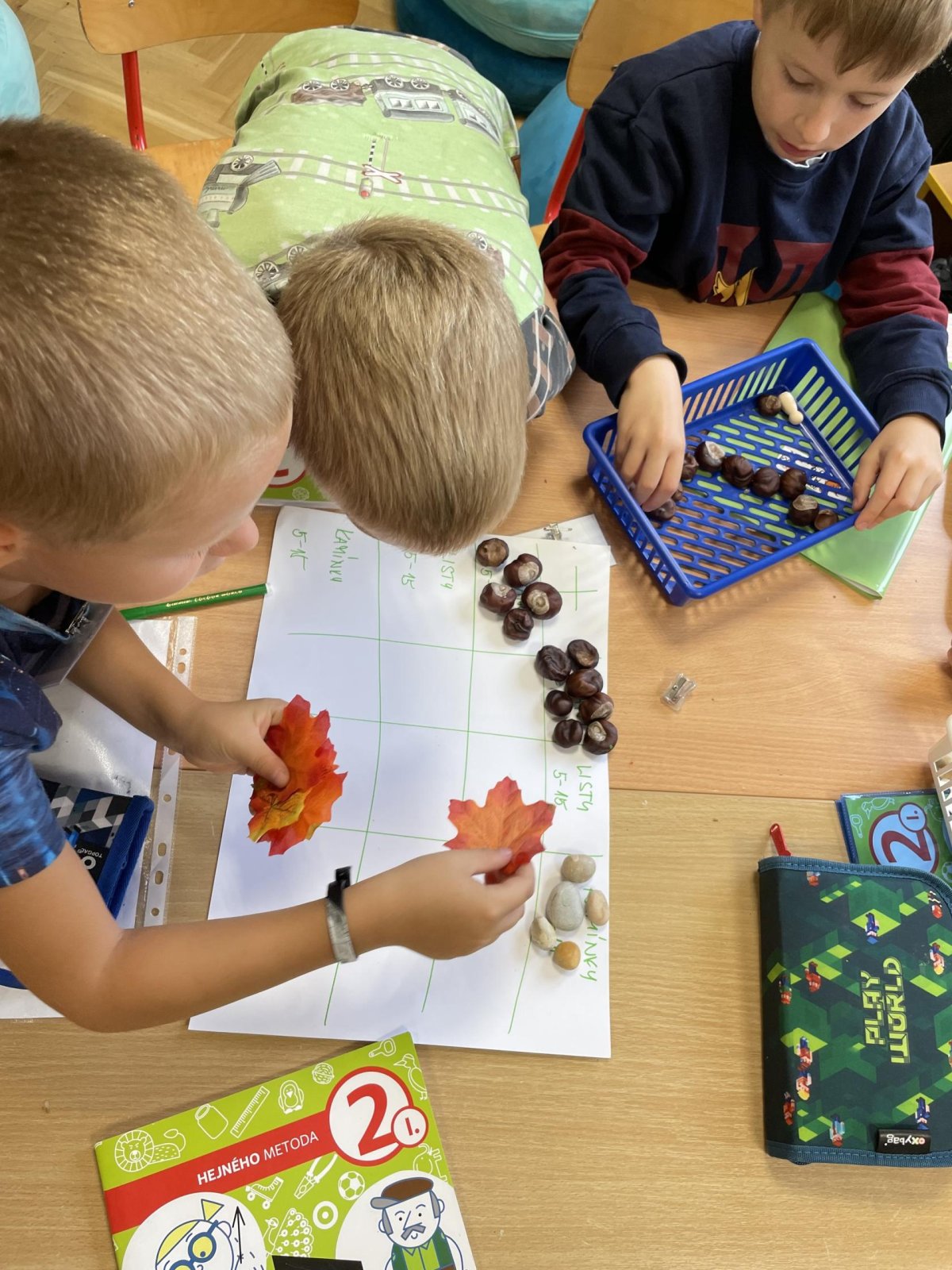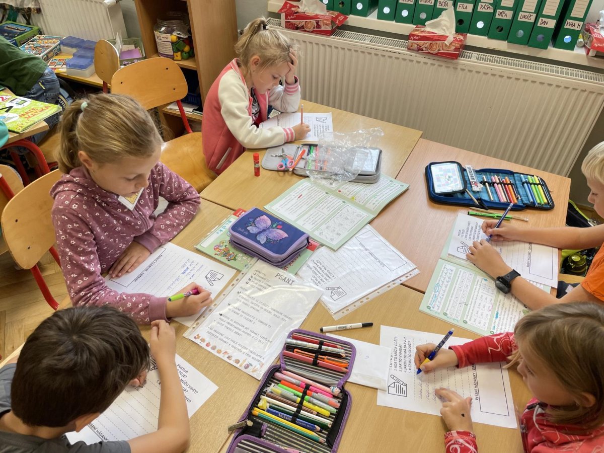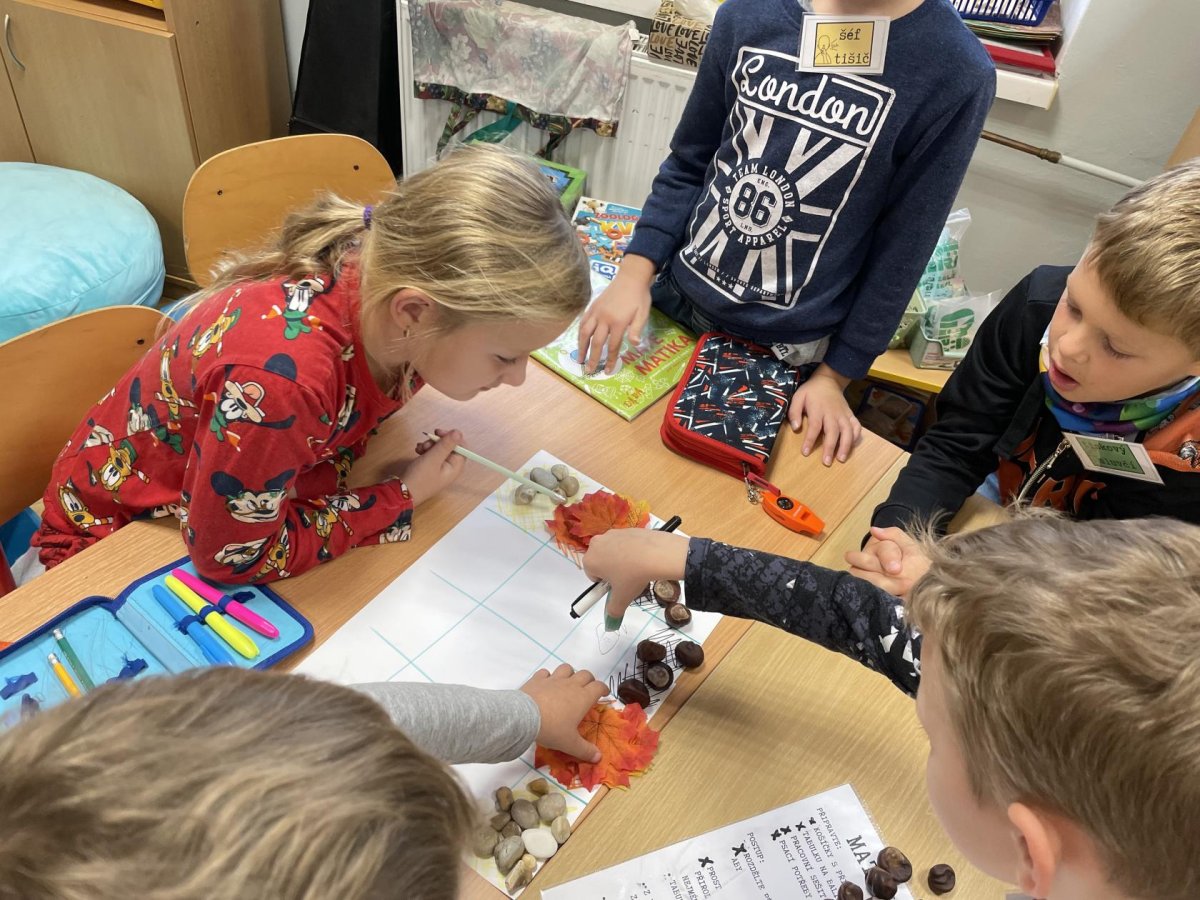 V září jsme se rozhodli v centrech aktivit pořádně prozkoumat téma podzim.V matematice jsme z podzimních přírodnin rovnali barevný rytmus a zkoumali jsme, jak funguje sčítací tabulka.V centru psaní jsme zkoušeli vymýšlet a zapisovat hádanky, jejichž řešením byla některá z tipicky podzimních plodin. V centru čtení jsme četli článek o javoru, který se na podzim červená. Bylo to studem nebo ne? V ateliéru jsme se pak pokoušeli vytvořit co největší množství odstínů podzimních barev. Absolutním hitem se ale stalo centrum vědy a pokusů, kde jsme pomocí digitálního mikroskopu zkoumali nejrůznější podzimní dary lesa (vřes, houby, semena dýní, mech, šišky). V samém závěru center aktivit nemohl chybět podzimní strom složený z lístečku, na které děti zapisovaly, co se během center naučily. A ci na centrech aktivit milujeme ze všeho nejvíc? To, že si svoje učení můžou děti naplánovat podle sebe,učí se sami sebe a své učení řídit a jsou si za něj zodpovědné.Každá centra se posouváme o malý krůček blíž k efektivní spolupráci a pilujeme schopnost sebeřízení. Není to snadná cesta, ale je to jedna z těch, které nás učí opravdu podstatné dovednosti pro život.