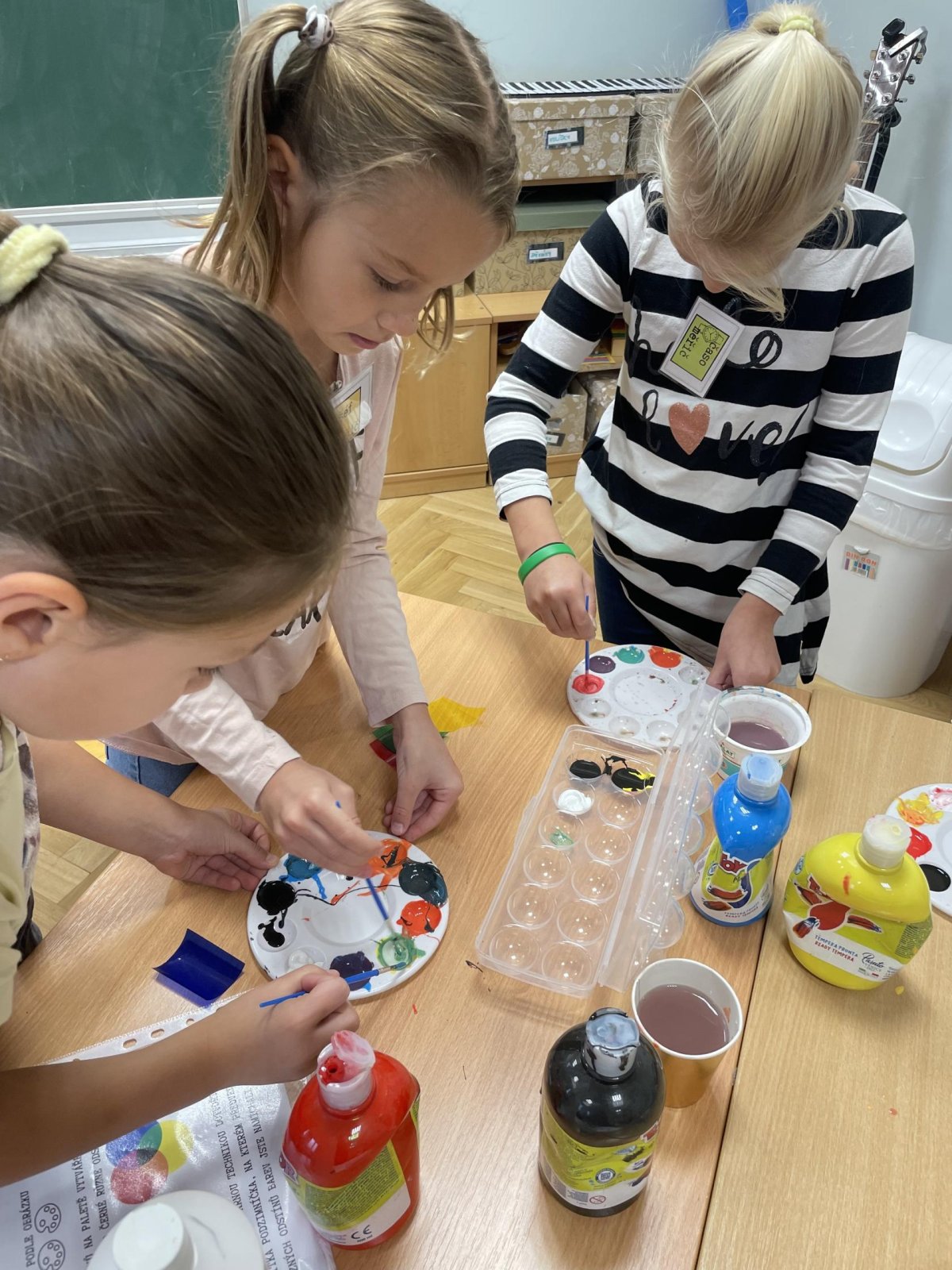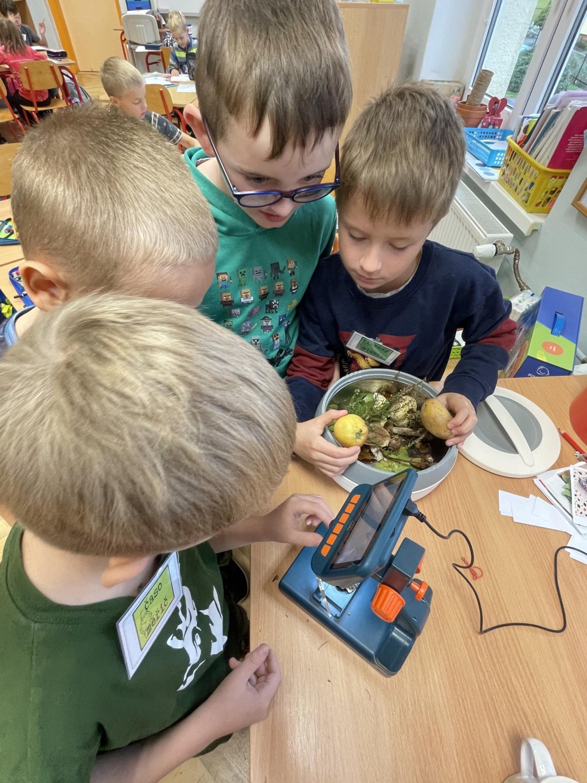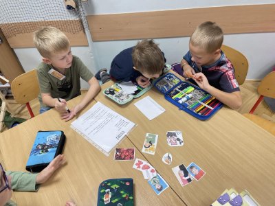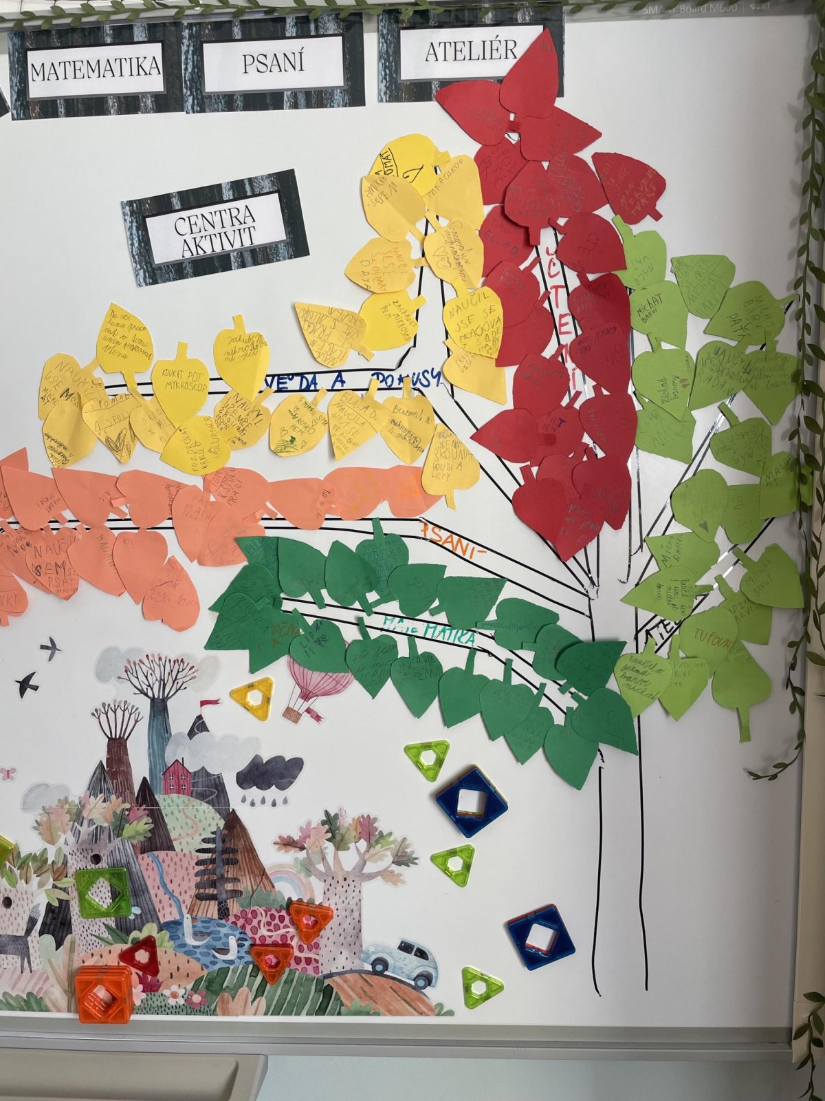 V září jsme se rozhodli v centrech aktivit pořádně prozkoumat téma podzim.V matematice jsme z podzimních přírodnin rovnali barevný rytmus a zkoumali jsme, jak funguje sčítací tabulka.V centru psaní jsme zkoušeli vymýšlet a zapisovat hádanky, jejichž řešením byla některá z tipicky podzimních plodin. V centru čtení jsme četli článek o javoru, který se na podzim červená. Bylo to studem nebo ne? V ateliéru jsme se pak pokoušeli vytvořit co největší množství odstínů podzimních barev. Absolutním hitem se ale stalo centrum vědy a pokusů, kde jsme pomocí digitálního mikroskopu zkoumali nejrůznější podzimní dary lesa (vřes, houby, semena dýní, mech, šišky). V samém závěru center aktivit nemohl chybět podzimní strom složený z lístečku, na které děti zapisovaly, co se během center naučily. A ci na centrech aktivit milujeme ze všeho nejvíc? To, že si svoje učení můžou děti naplánovat podle sebe,učí se sami sebe a své učení řídit a jsou si za něj zodpovědné.Každá centra se posouváme o malý krůček blíž k efektivní spolupráci a pilujeme schopnost sebeřízení. Není to snadná cesta, ale je to jedna z těch, které nás učí opravdu podstatné dovednosti pro život.