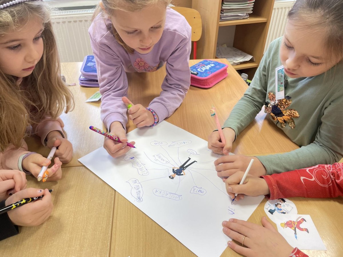V centru PSANÍ děti zkoušely vytvářet myšlenkové mapy k jednotlivým povoláním. Sestavovaly koláč jednotlivých profesí, jejich potřeb a oficiálních názvů. Hádaly hádanky a také hádanky o profesích vytvářely.
