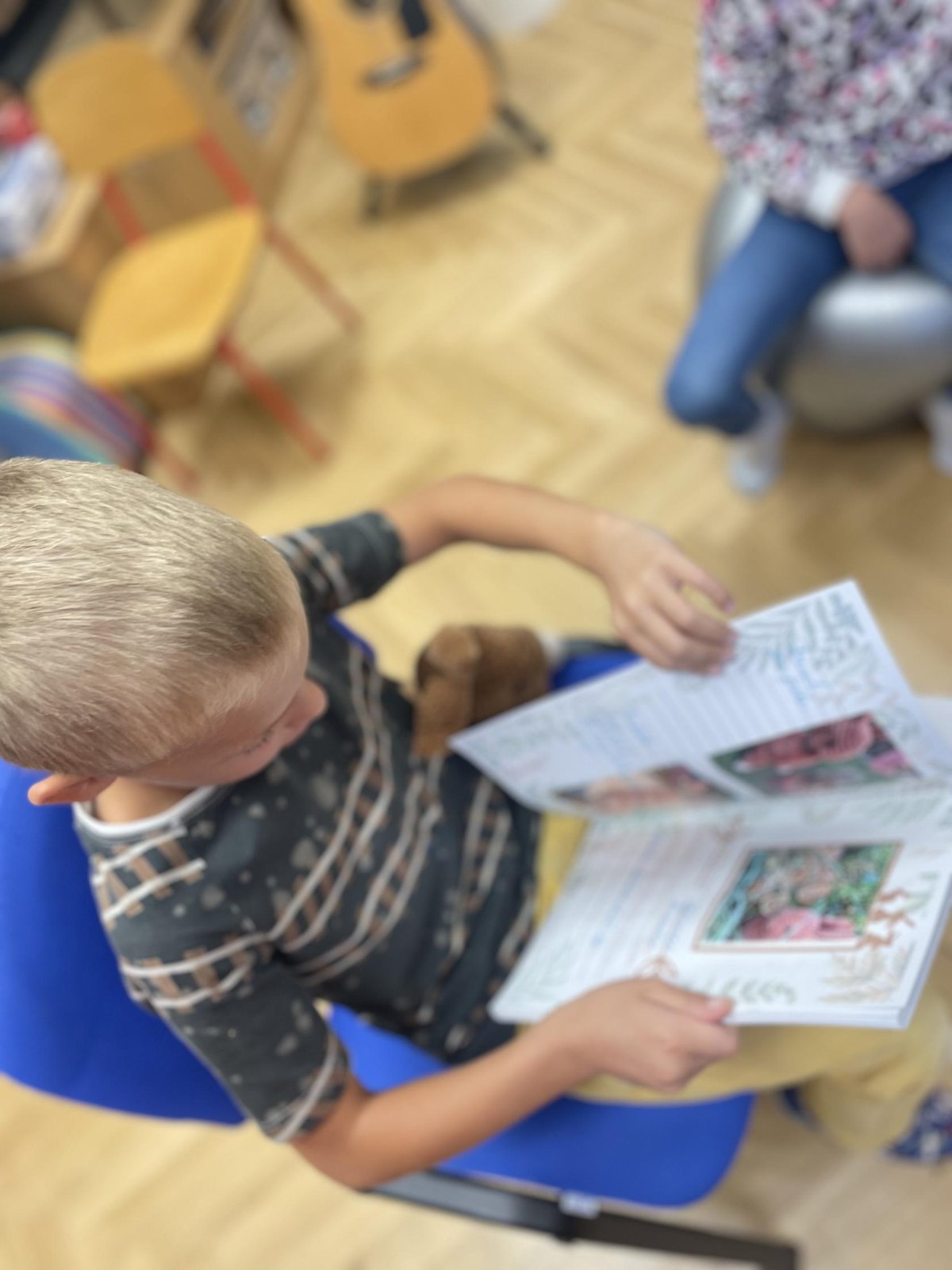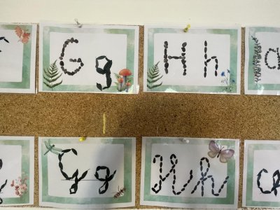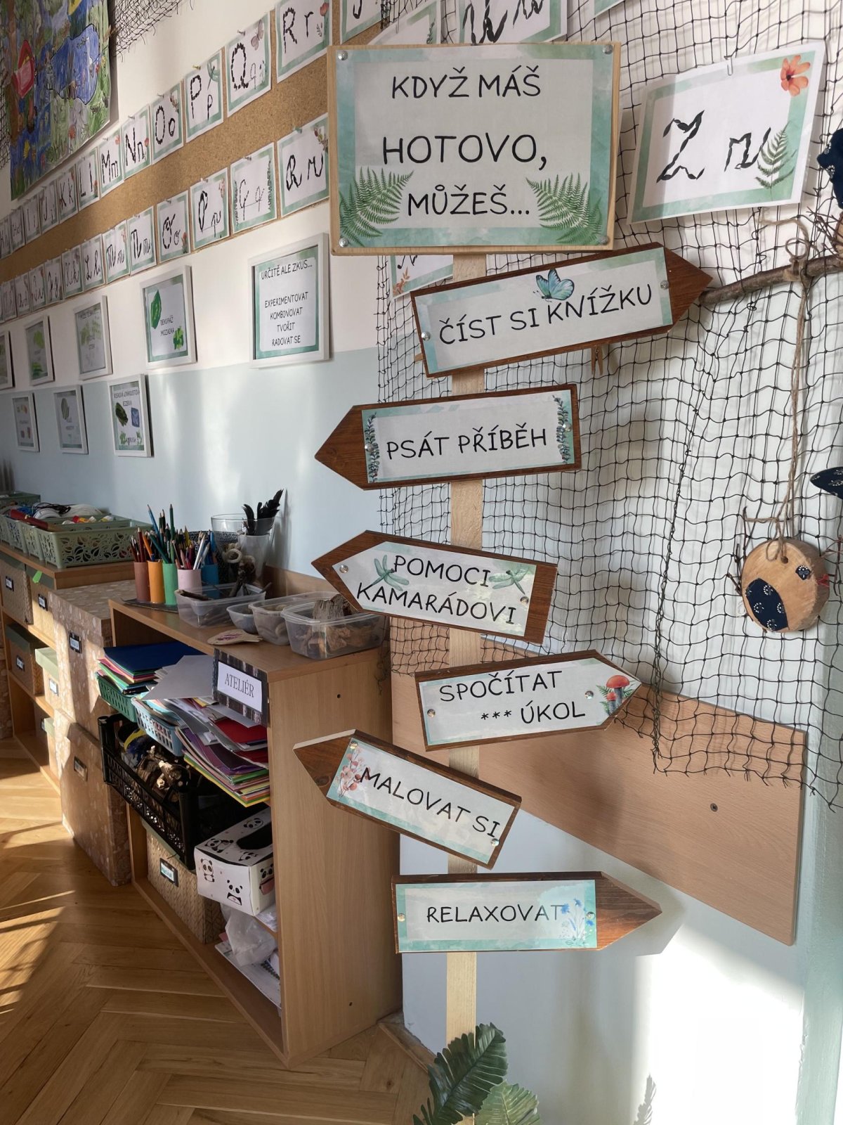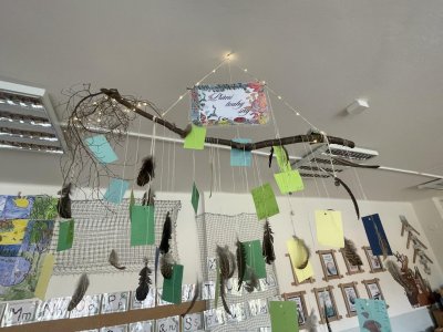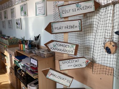 Ve třídě je čekalo mnoho novinek.Z krajiny dinosauří jsme se přesunuli do kouzelného lesa, který nás bude po celý rok ve třídě obklopovat.Máme tu abecedu z oblázků a šišek, motivační citáty inspirované přírodou,magickou větývku s peříčky střežícími naše tajná přání i rozcestník,kterým se necháváme jako správní pocestní vést.