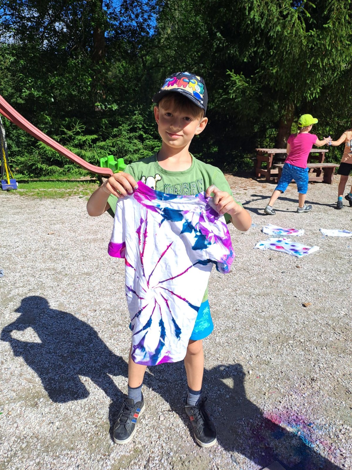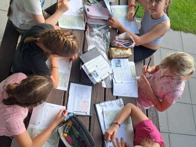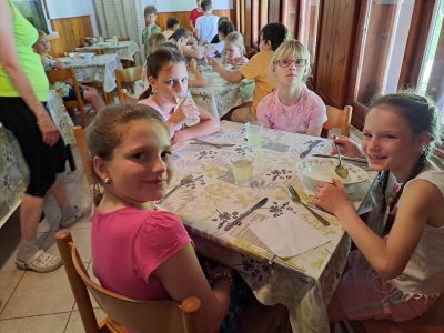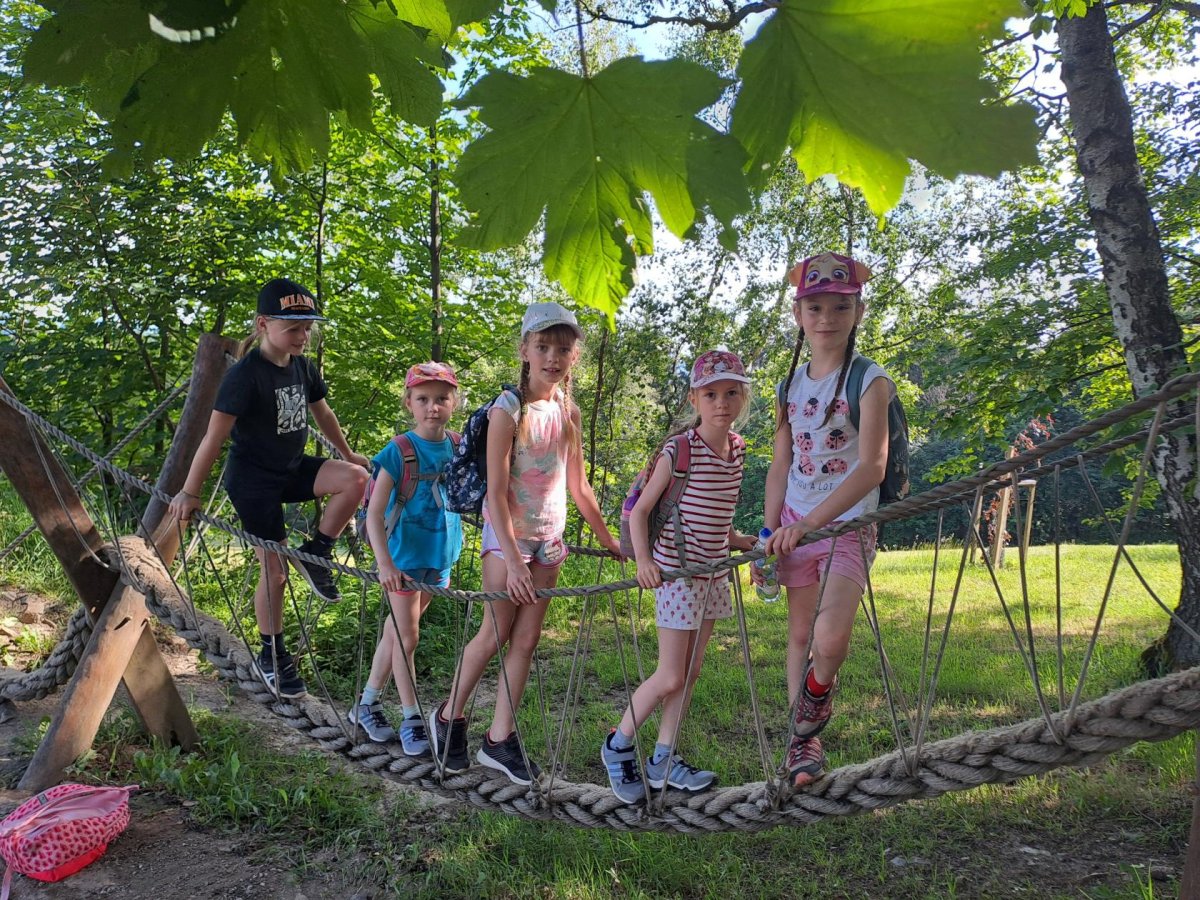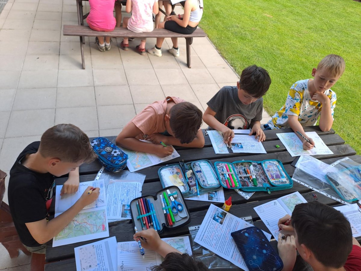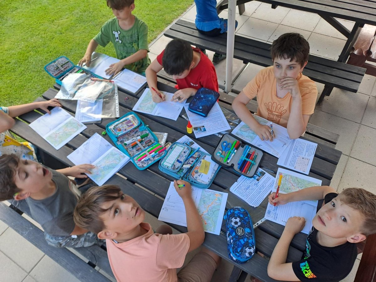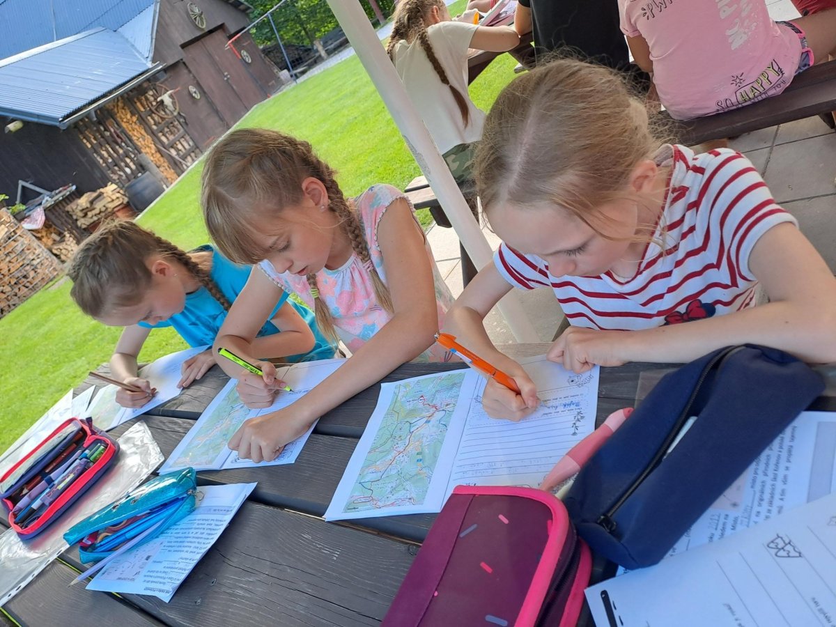 Druhý den, který byl nabitý programem i zážitky, je za námi. Dopoledne jsme věnovali „konstruování“ skafandrů…. A že se povedly!!! Co kus, to originál. Pak nám tu přistála další bleděmodrá obálka. Zpráva zašifrovaná do Morseovy abecedy nám dala trochu zabrat, ale místo, kde máme hledat poklad, se nám rozluštit povedlo (A ten zmiňovaný dub, jsme opravdu našli! A to překvapení pod ním též!). Po výborné omáčce jsme vystoupali k areálu u Čápa, seznámili se s postavou Járy Cimrmana, vyšplhali na Maják, prozkoumali exponáty v Cimrmanově muzeu, zablbli si na hřišti u penzionu U Čápa a pak se vydali prozkoumat lesopark Na Slunečné, včetně Pohádkové cesty. A že tu je co objevovat, s výhledy na tu krásu kolem. Počasí jak vymalované…, prostě luxusní den. Navečer jsme si vše zaznamenali do Deníčků a ještě zvládli další část úkolů a výzev ze hry Survivor. Špaget jsme snědli víc, než byste si troufali odhadnout…. No a tak teď už jen ten fotbal, aby stál za to! Dobrou noc!