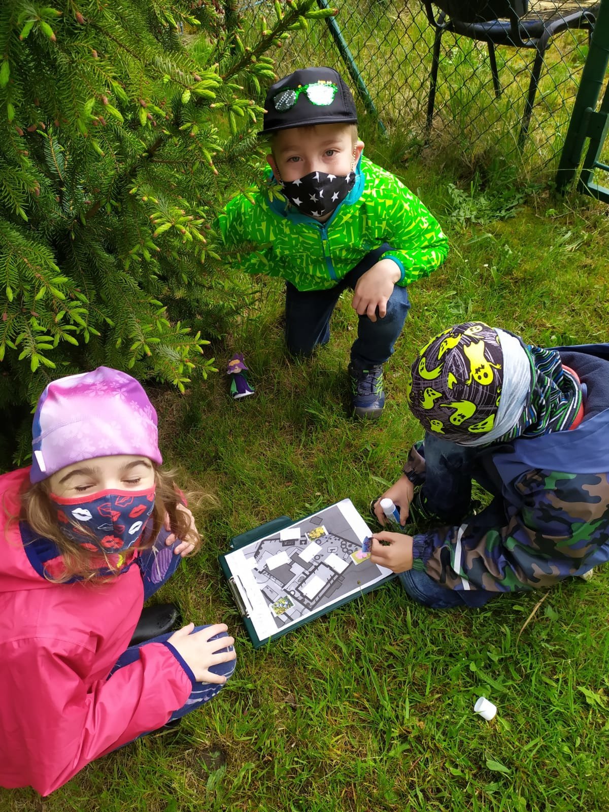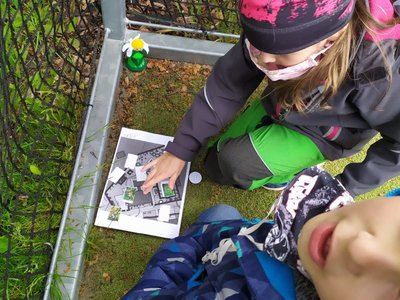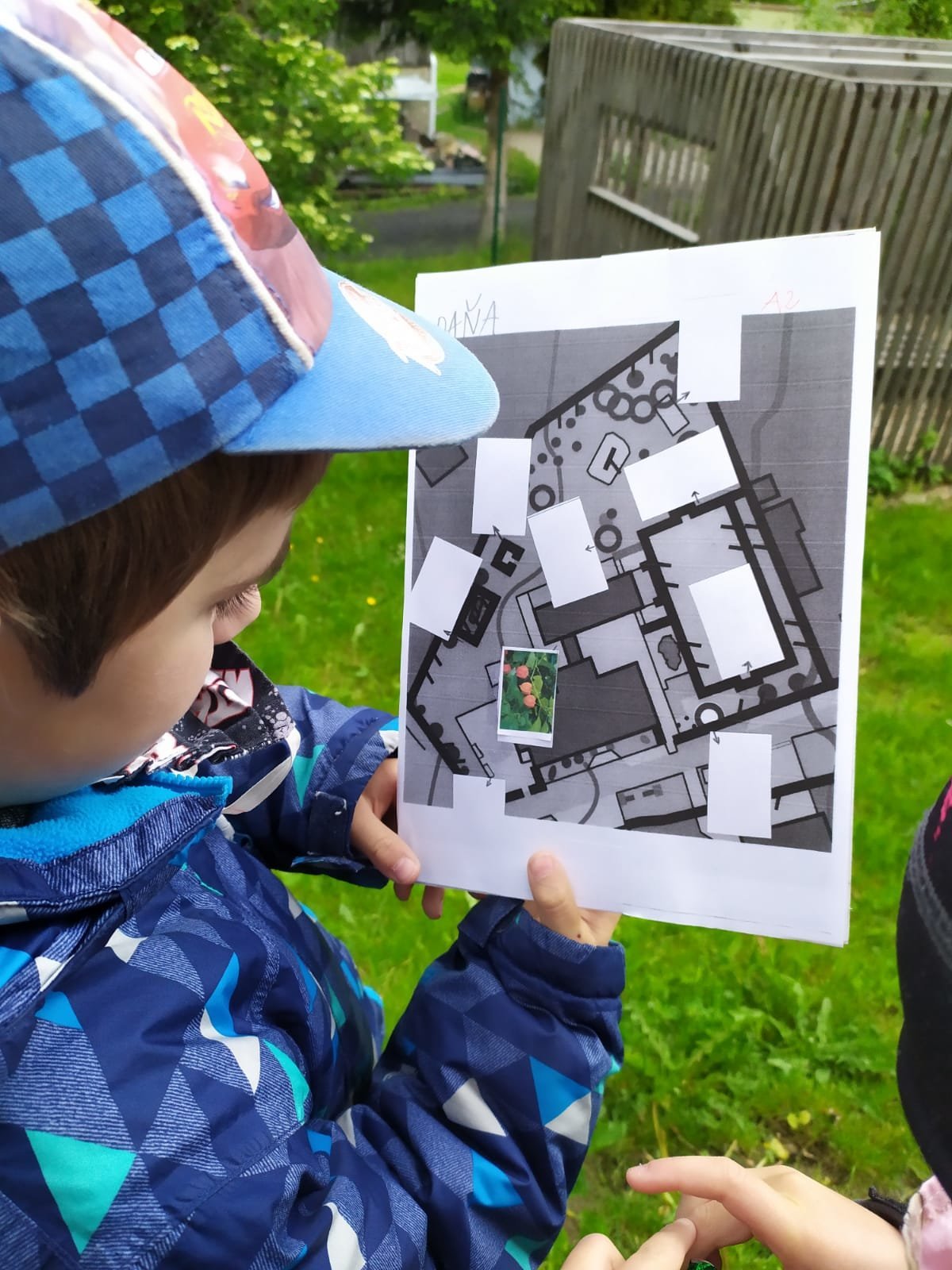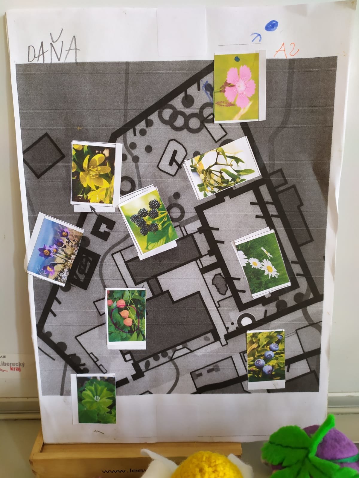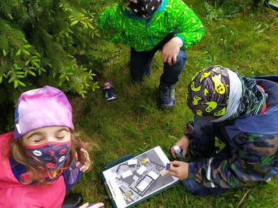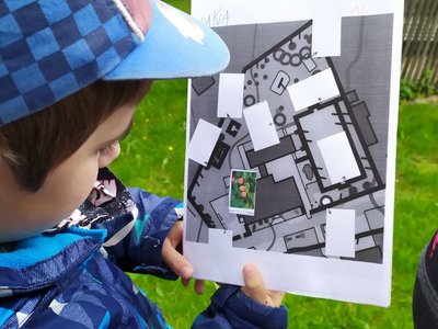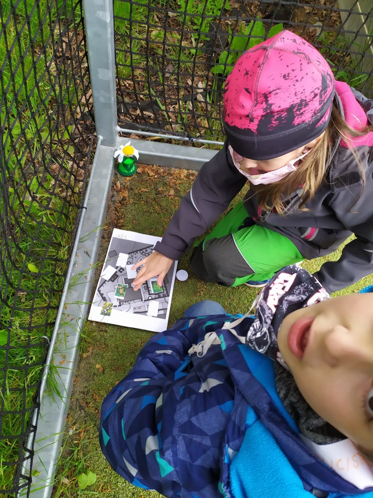 Po zahradě se nám poschovaly kytičkové panenky. Podle mapy jsme je hledali a pak do mapy nalepili jejich rostlinky. Pak jsme si ve dvojicích schovali vzájemně obrázky mláďat a zaznamenali do mapy. Kdo si ho našel, tomu zůstal :-).