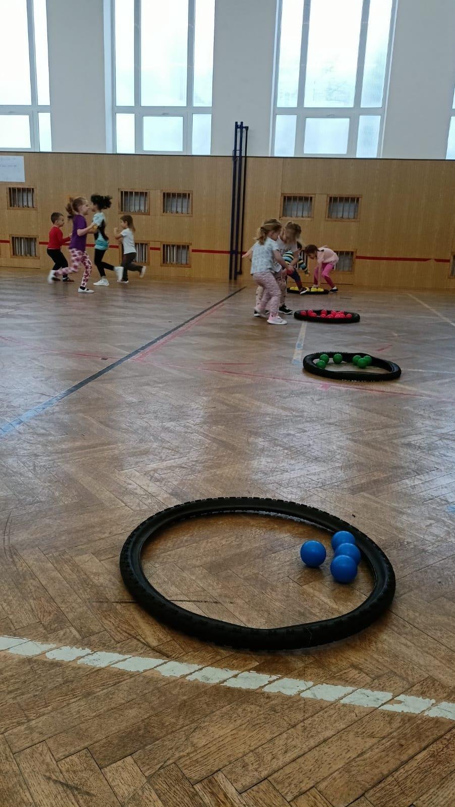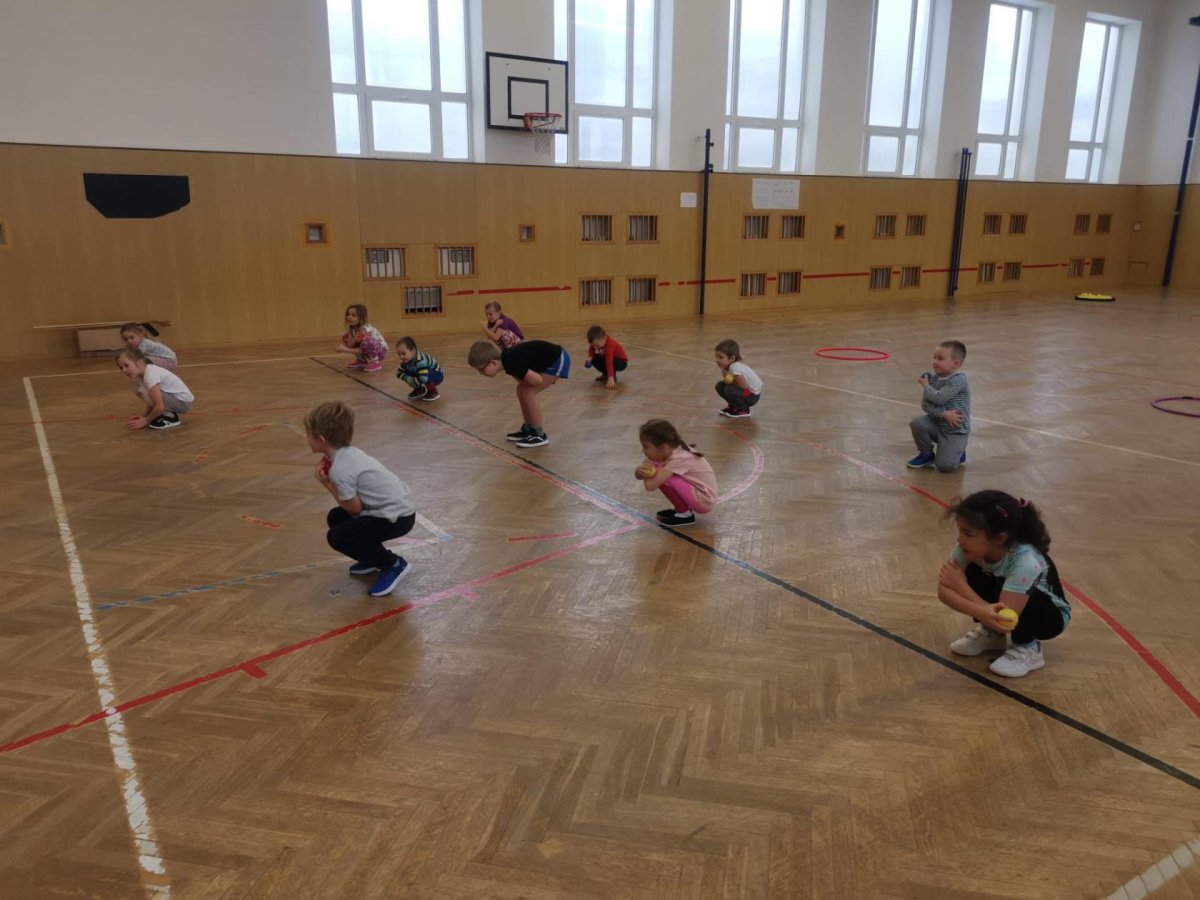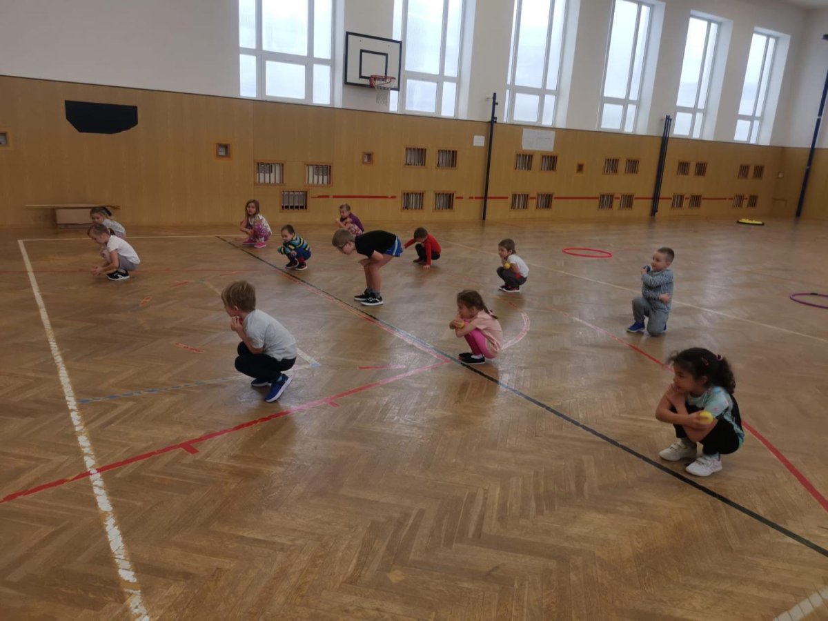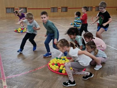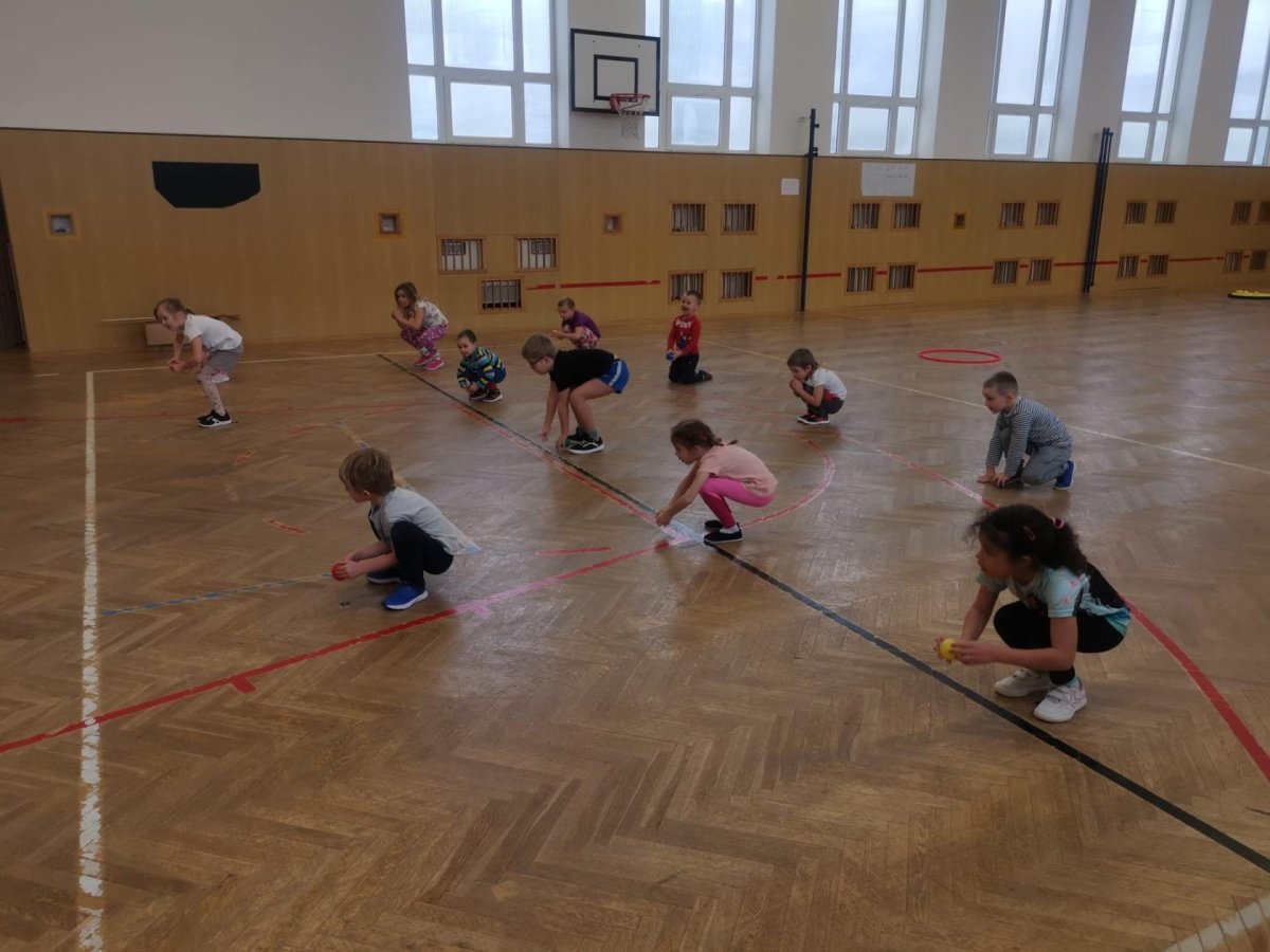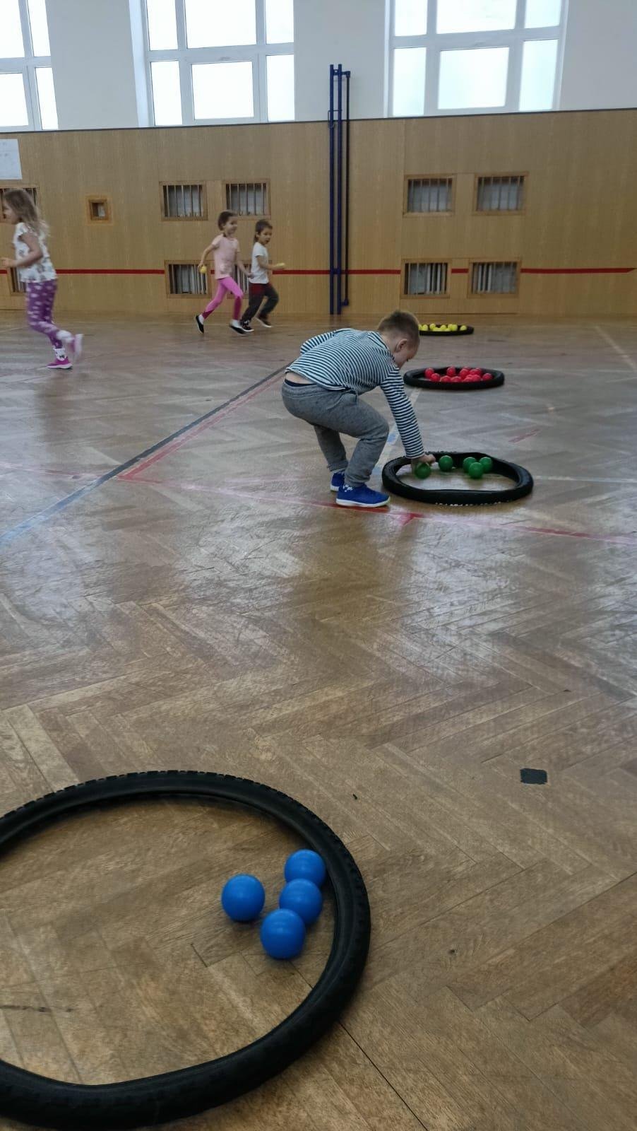 Děti si při cvičení v tělocvičně procvičily rychlost, postřeh, obratnost, třídění podle barev, zručnost, spolupráci ve skupinách a ve dvojicích.