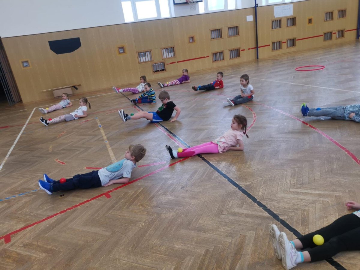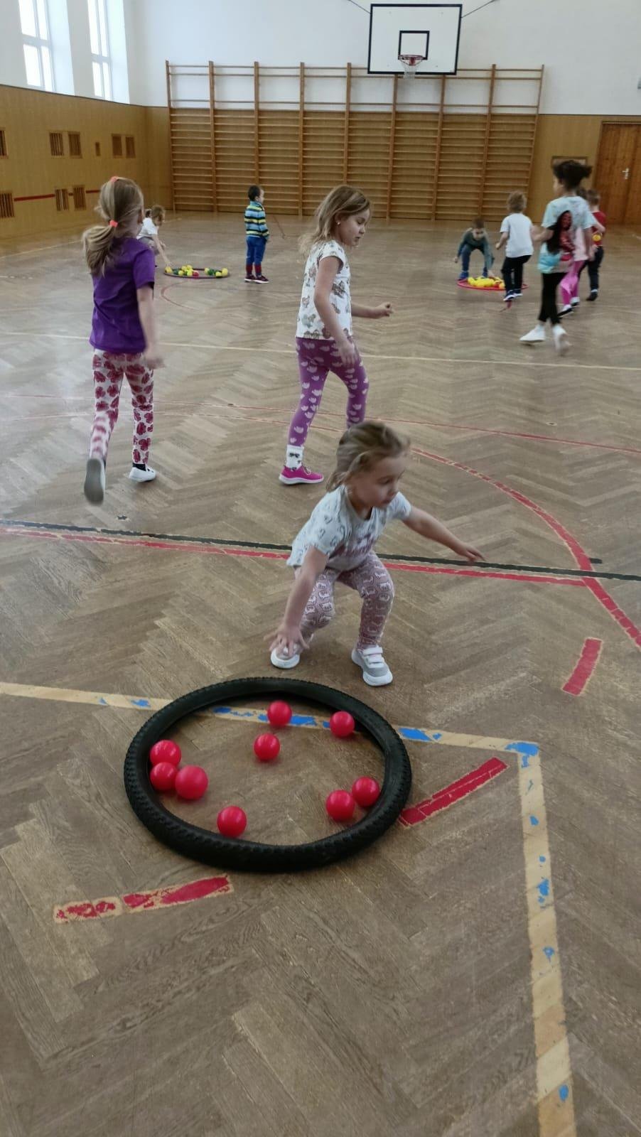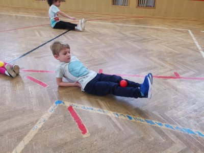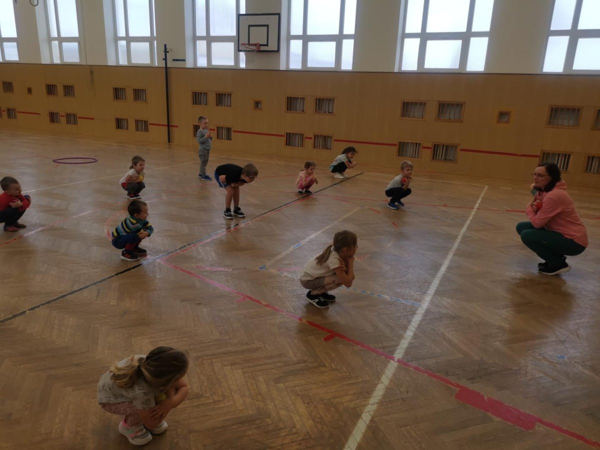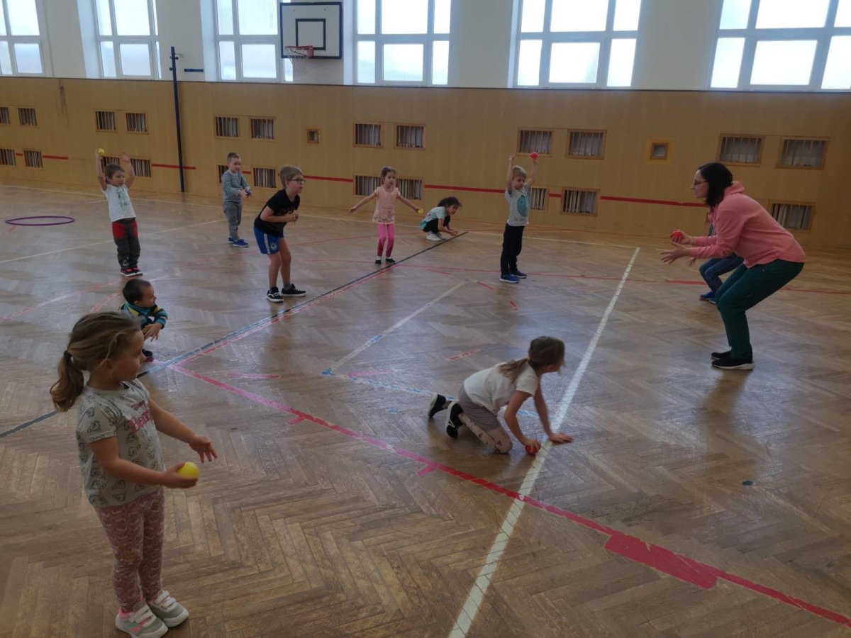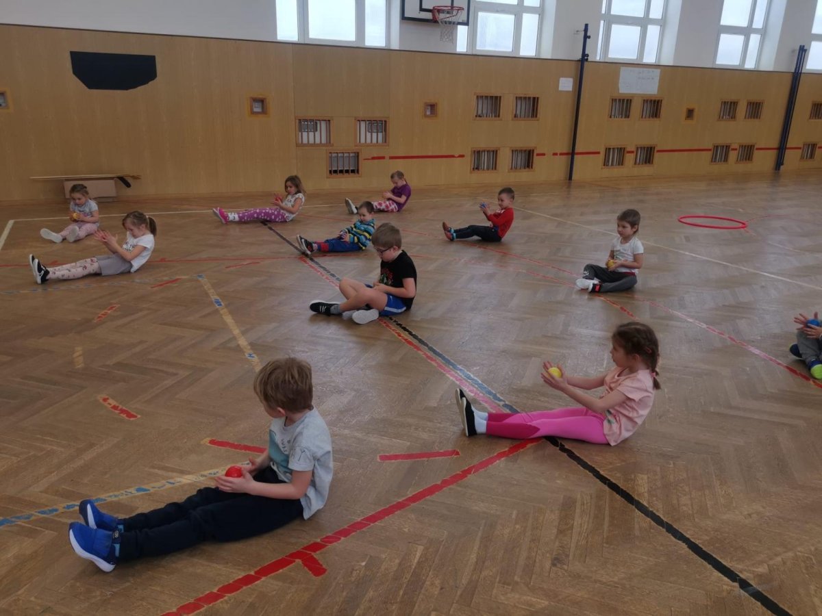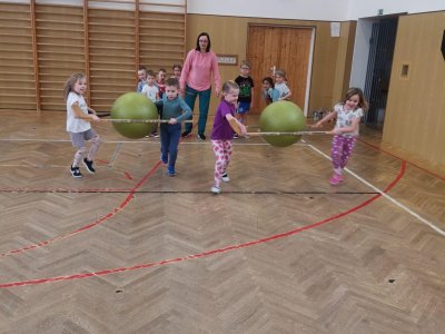 Děti si při cvičení v tělocvičně procvičily rychlost, postřeh, obratnost, třídění podle barev, zručnost, spolupráci ve skupinách a ve dvojicích.