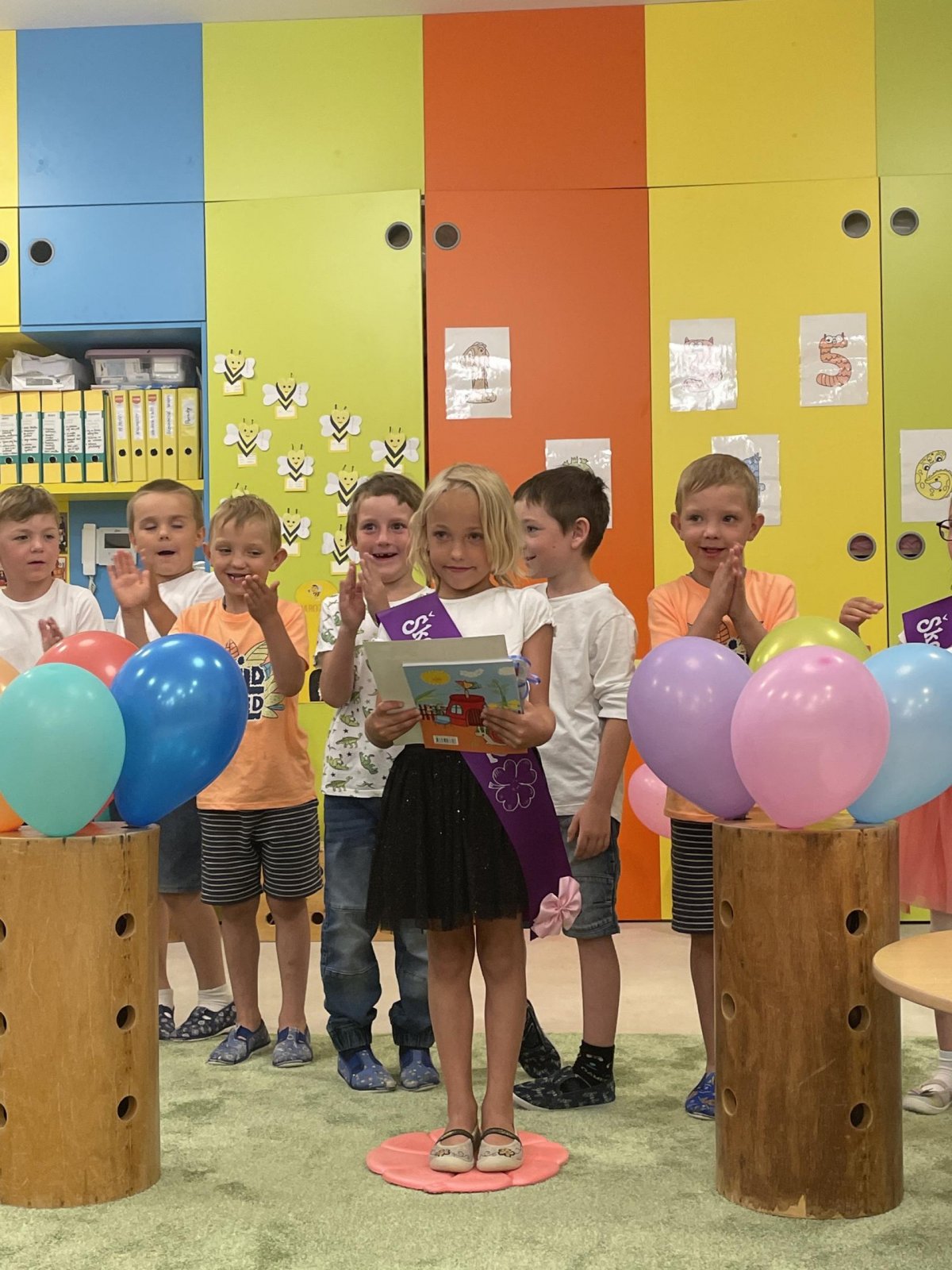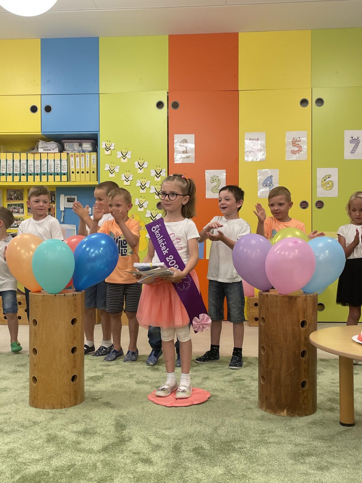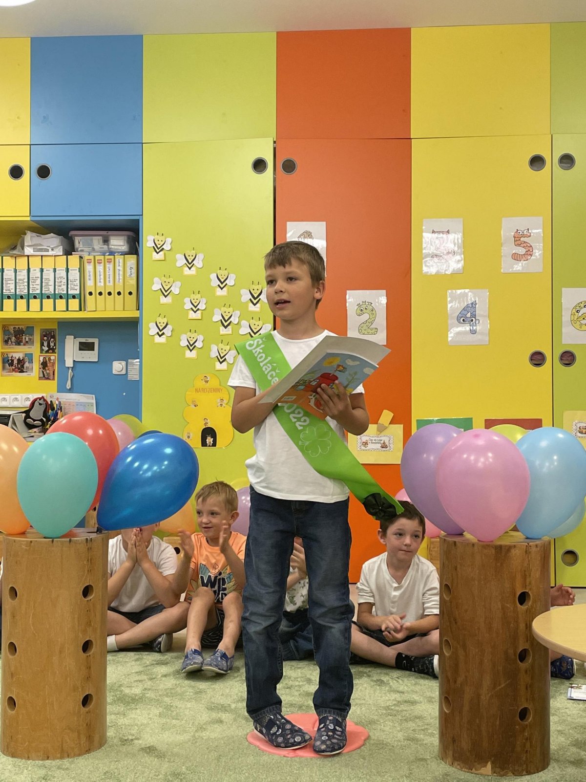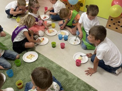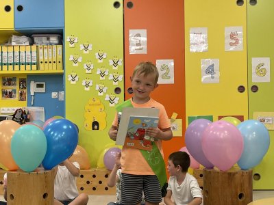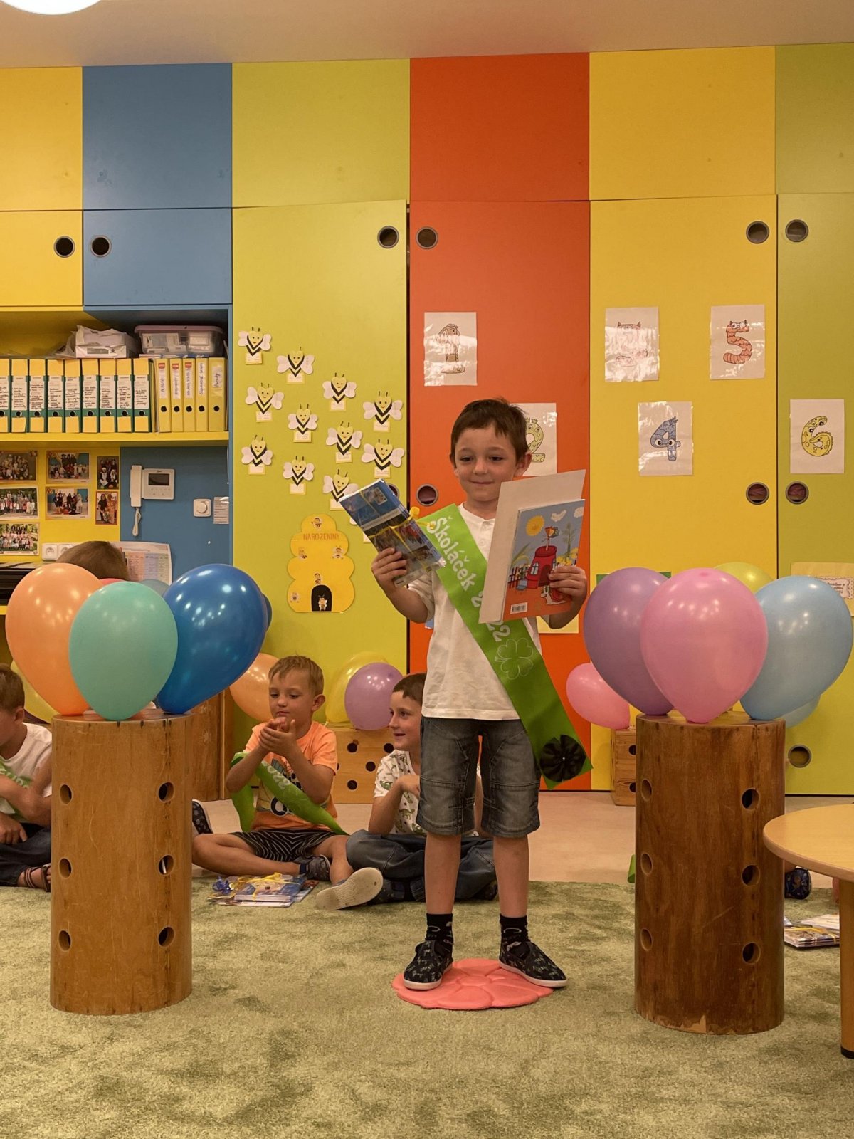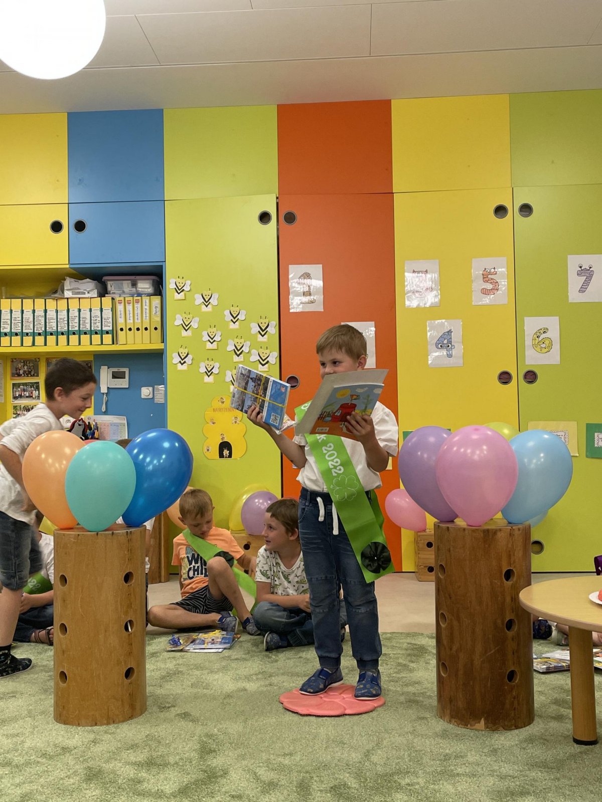 Netradičně v 17 hod. se otevřela školka pro všechny budoucí prvňáčky a jejich rodiče - čekalo nás rozloučení s MŠ. Na úvod děti vystoupily s pásmem básniček, písniček a tanečkem. Poté následovalo šerpování předškoláků, každý si na památku odnesl knihu, šerpu a dárek.