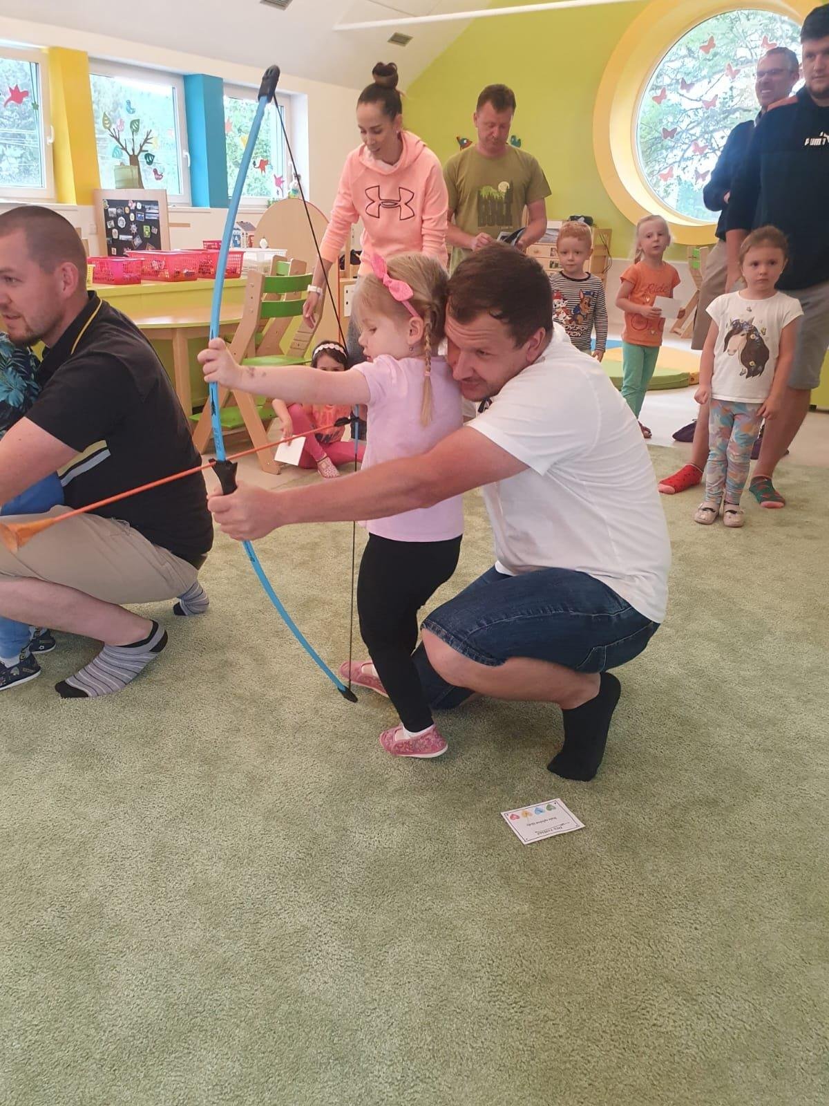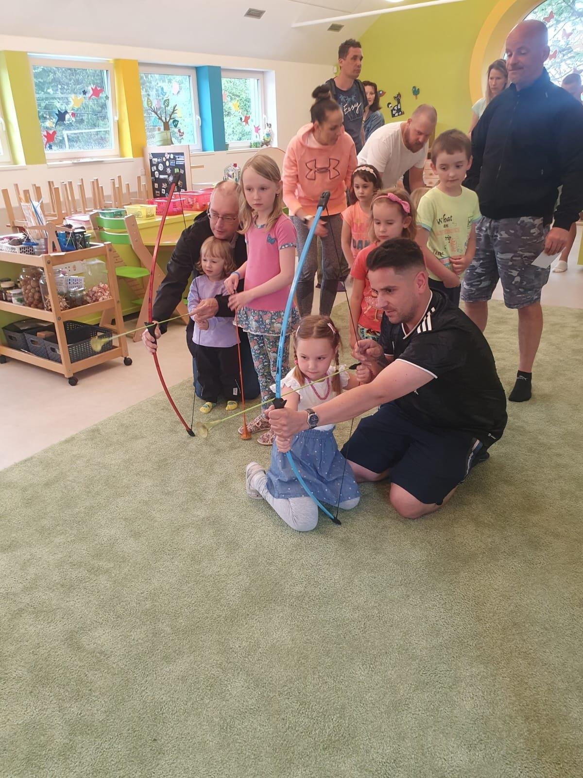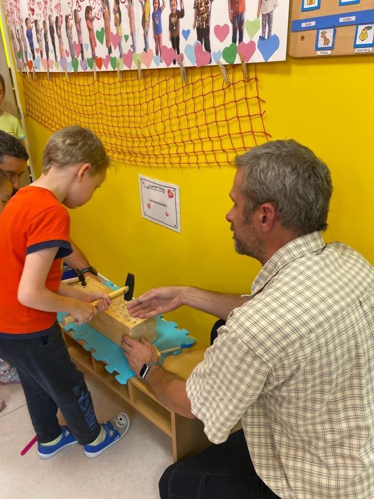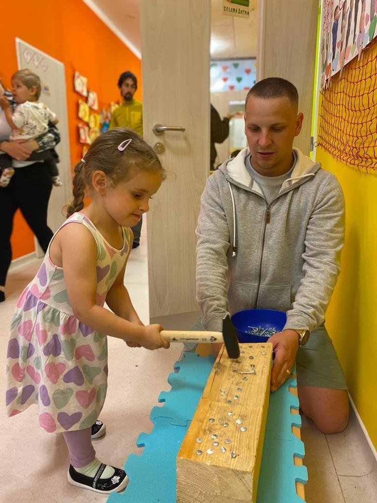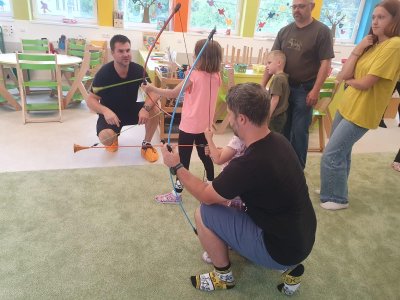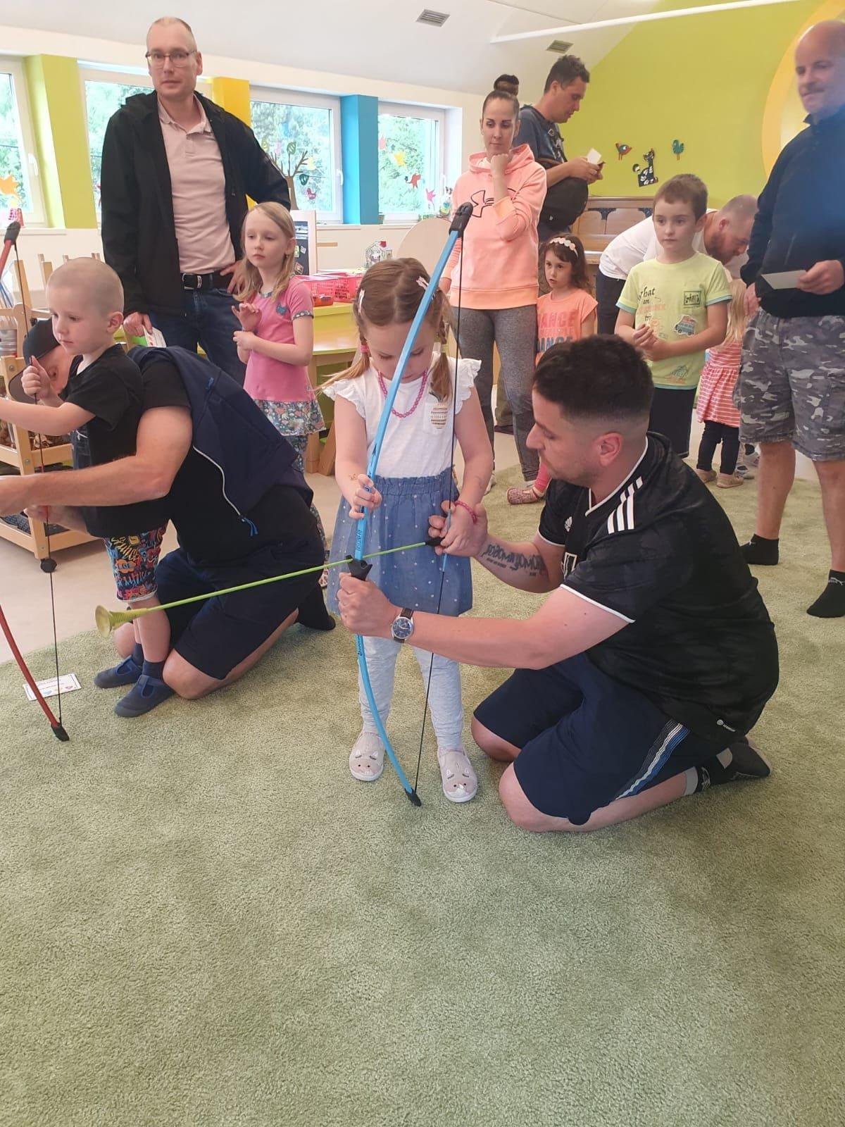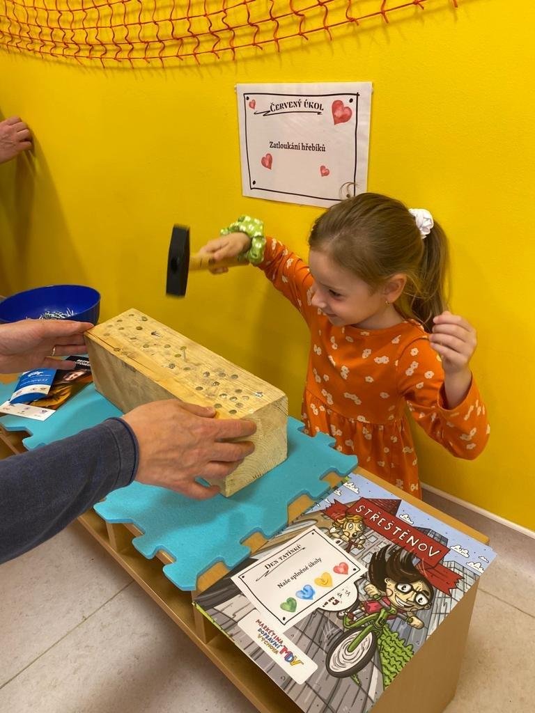 Dne 13.6.2023 jsme uspořádali ve školce akci ke Dni otců. Pro děti a tatínky byly připraveny tyto úkoly: zatloukání hřebíků, fotbal, střelba z luku, jízda na koníkovi a jako bonus nás navštívila Markétina dopravní výchova s ukázkou, jak se správně a bezpečně poutat při jízdě v autě. Děti si postupně splněné úkoly odškrtávaly a na závěr předaly svým tatínkům dáreček. :-)