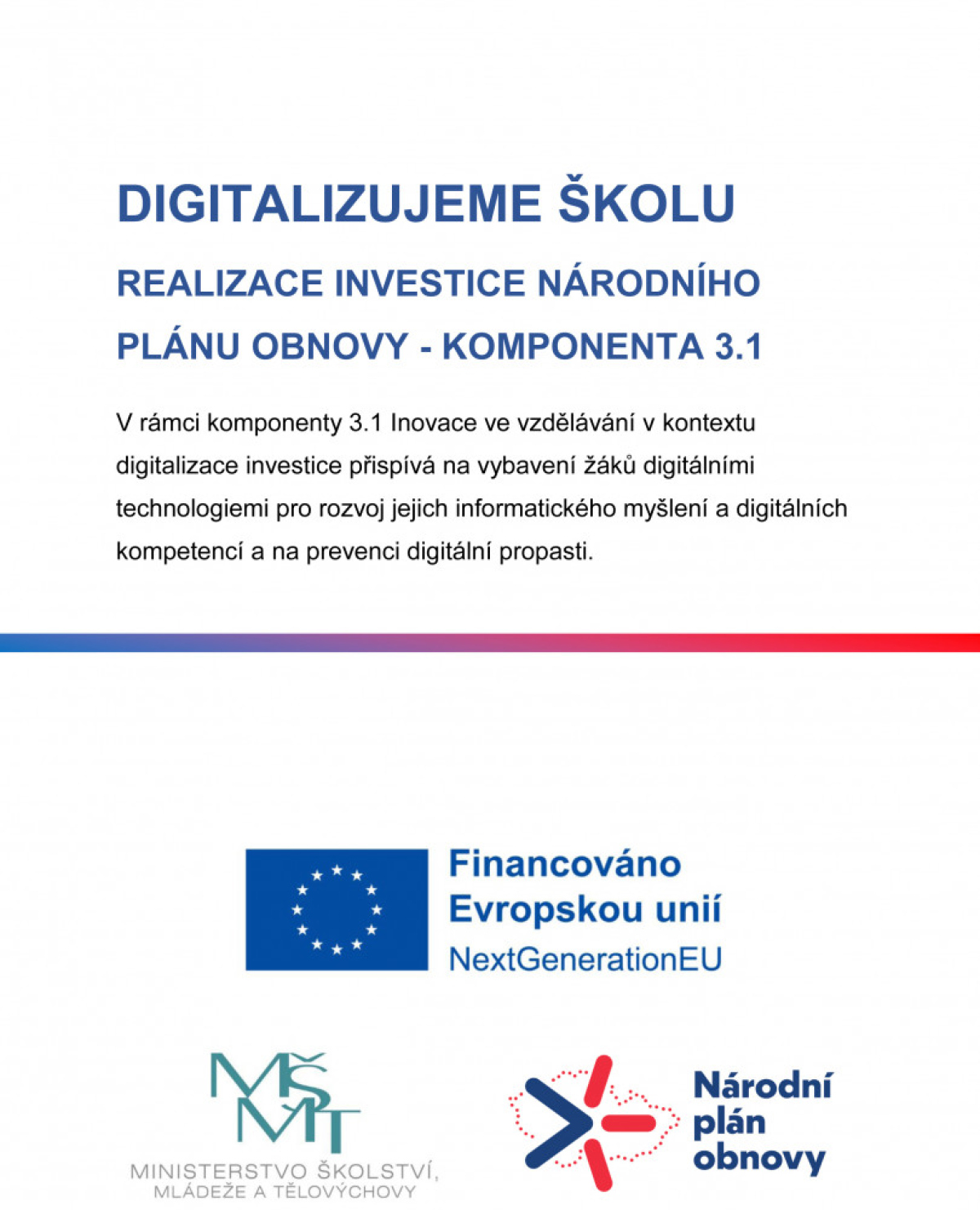 NPO - DIGITALIZUJEME ŠKOLU - REALIZACE INVESTICE NÁRODNÍHO PLÁNU OBNOVY 3.1 Inovace ve vzdělávání v kontextu digitalizace