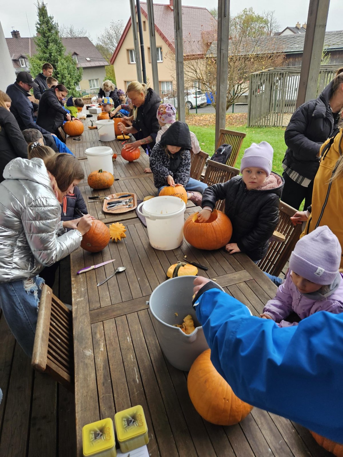 Ve středu odpoledne se školní zahrada prvního stupně proměnila v podzimní království plné barev, vůní a smíchu. Počasí sice úplně nepřálo – vítr si pohrával s listím a občas spadla kapka deště – ale nikomu to nezkazilo náladu. Děti, rodiče i učitelé přišli s úsměvem a užili si odpoledne plné her, tvoření a dobrého jídla.