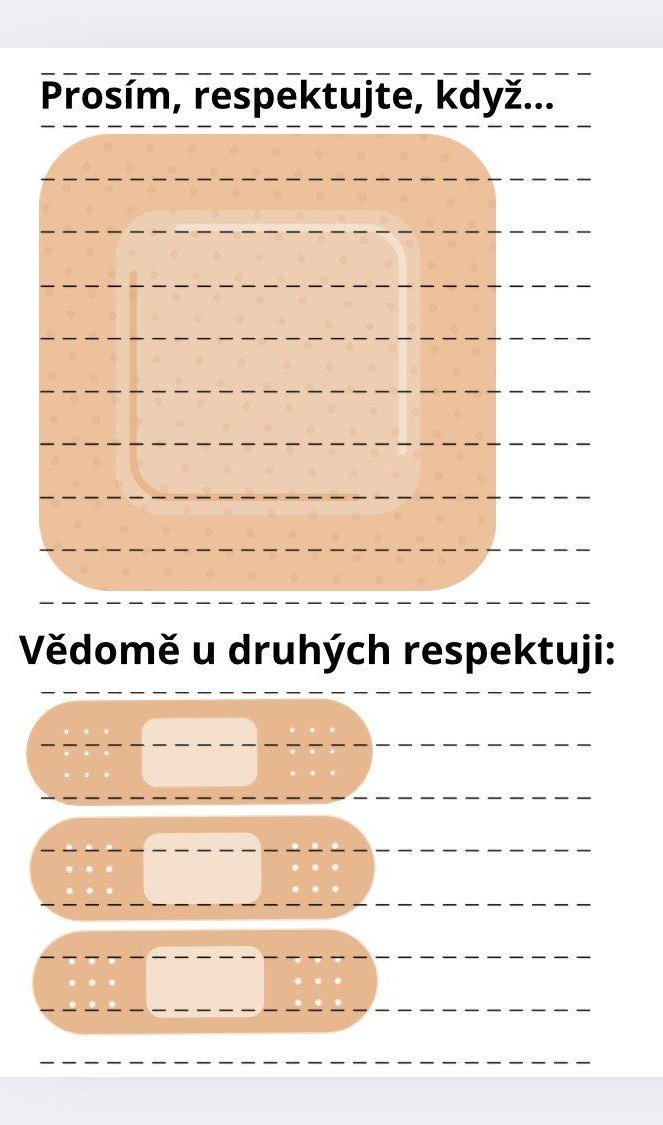Každý z nás si proto napsal na náplast, na co by si přál, aby druzí brali častěji ohled. Tyto náplasti teď ve třídě připomínají, že máme různé potřeby a že se vyplatí naslouchat tomu, co je pro druhého důležité.