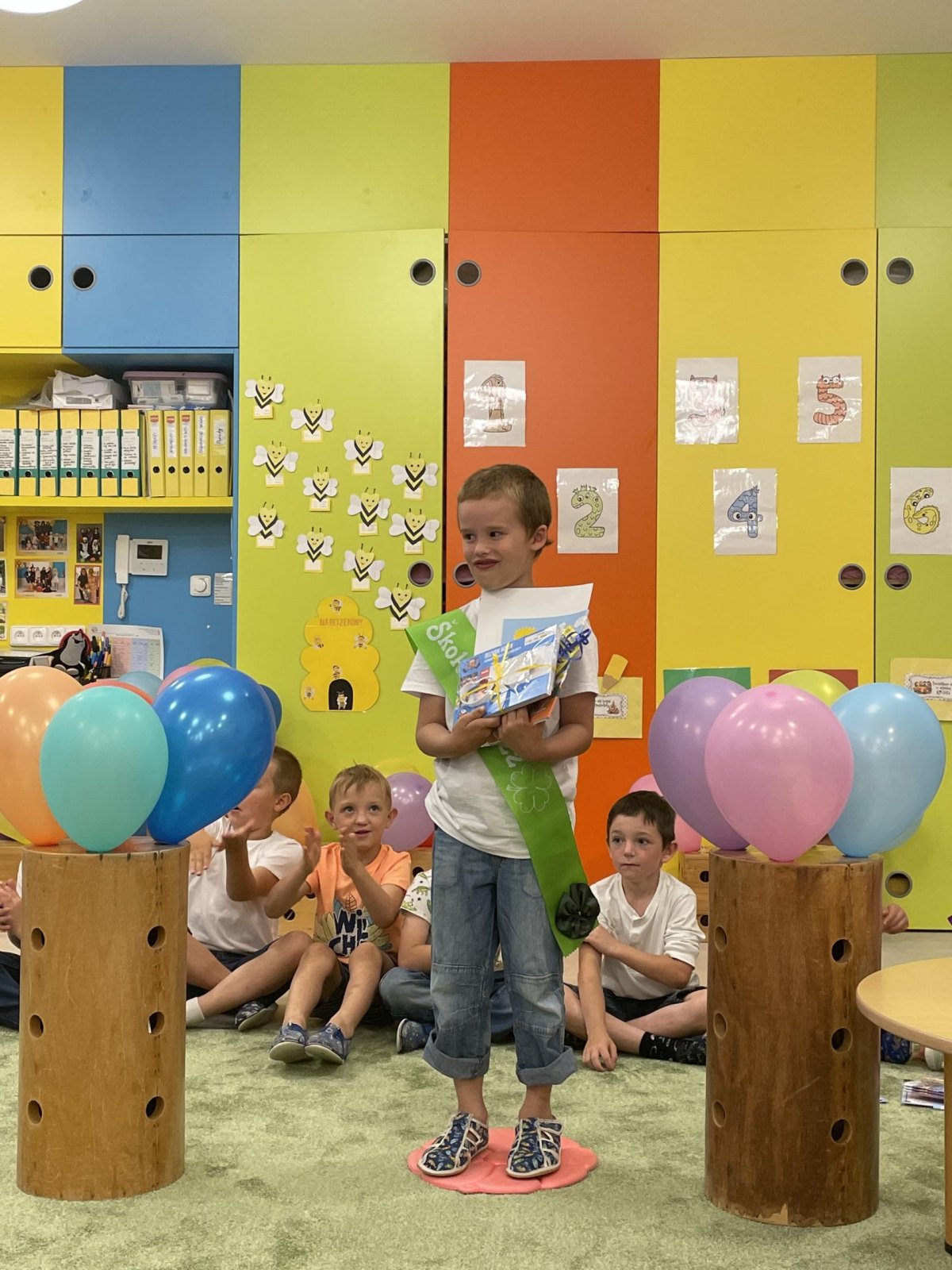 Netradičně v 17 hod. se otevřela školka pro všechny budoucí prvňáčky a jejich rodiče - čekalo nás rozloučení s MŠ. Na úvod děti vystoupily s pásmem básniček, písniček a tanečkem. Poté následovalo šerpování předškoláků, každý si na památku odnesl knihu, šerpu a dárek.